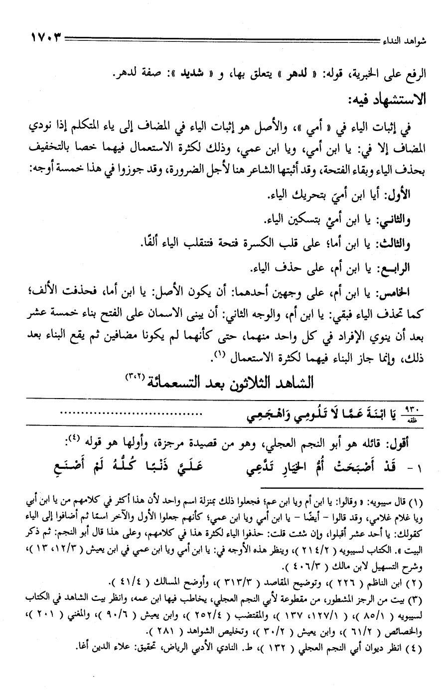 (¬1) قال سيبويه: "وقالوا: يا ابن أم ويا ابن عم؛ فجعلوا ذلك بمنزلة اسم واحد لأن هذا أكثر في كلامهم من يا ابن أبي ويا غلام غلامي، وقد قالوا -أيضًا- يا ابن أمي ويا ابن عمي؛ كأنهم جعلوا الأول والآخر اسمًا ثم أضافوا إلى الياء كقولك: يا أحد عشر أقبلوا، وإن شئت قلت: حذفوا الياء لكثرة هذا في كلامهم، وعلى هذا قال أبو النجم: ثم ذكر البيت". الكتاب لسيبويه (2/ 214)، وينظر هذه الأوجه في: يا ابن أمي ويا ابن عمي في ابن يعيش (3/ 12، 13)، وشرح التسهيل لابن مالك (3/ 406).