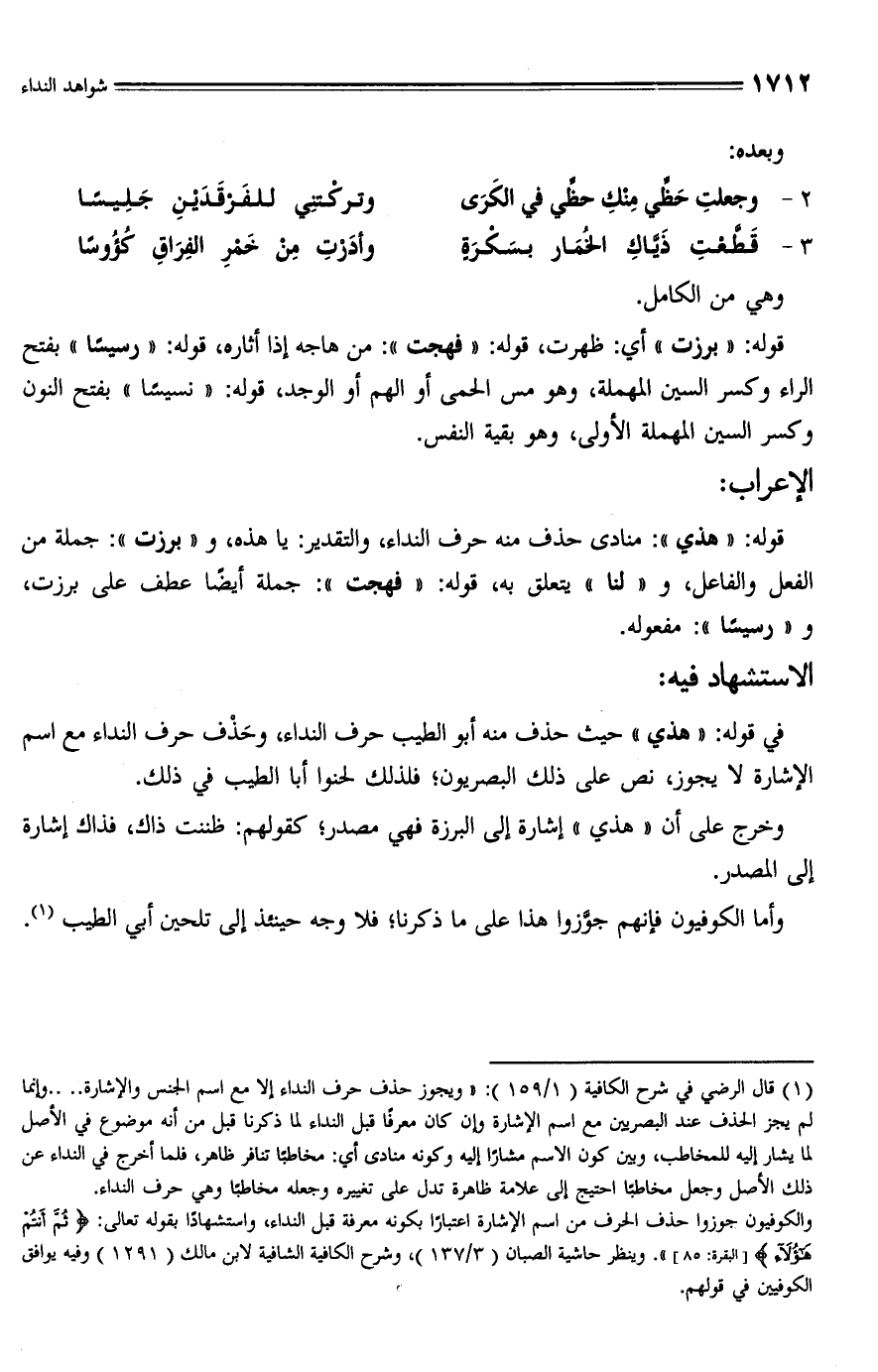 (¬1) قال الرضي في شرح الكافية (1/ 159): "ويجوز حذف حرف النداء إلا مع اسم الجنس والإشارة .... وإنما لم يجز الحذف عند البصريين مع اسم الإشارة وإن كان معرفًا قبل النداء لما ذكرنا قبل من أنَّه موضوع في الأصل لما يشار إليه للمخاطب، وبين كون الاسم مشارًا إليه وكونه منادى أي: مخاطبًا تنافر ظاهر، فلما أخرج في النداء عن ذلك الأصل وجعل مخاطبًا احتيج إلى علامة ظاهرة تدل على تغييره وجعله مخاطبًا وهي حرف النداء.