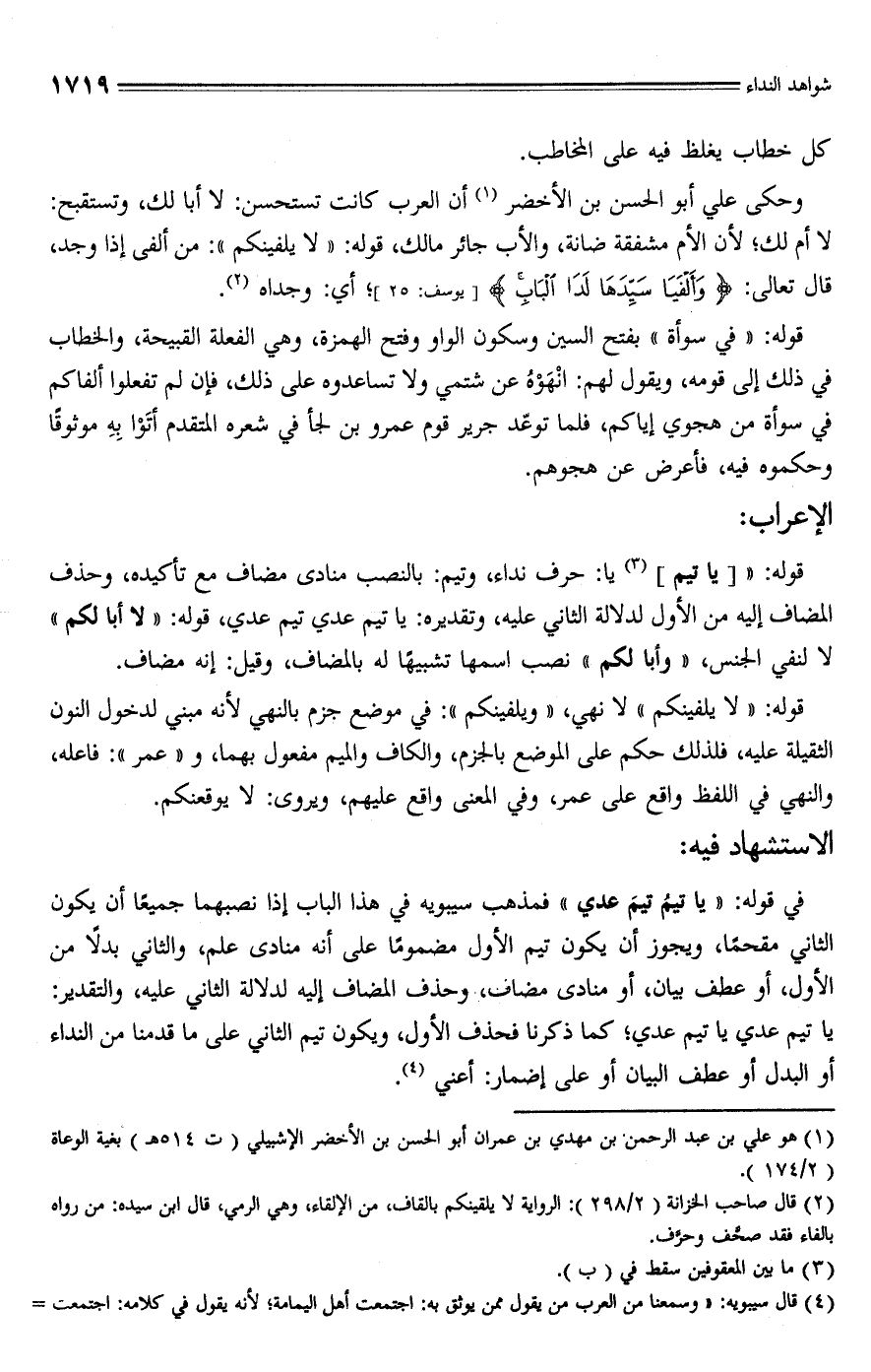 قوله: " [يا تيم] (¬3) يا: حرف نداء، وتيم: بالنصب منادى مضاف مع تأكيده، وحذف المضاف إليه من الأول لدلالة الثاني عليه، وتقديره: يا تيم عدي تيم عدي، قوله: "لا أبا لكم" لا لنفي الجنس، "وأبا لكم"، نصب اسمها تشبيهًا له بالمضاف، وقيل: إنه مضاف.