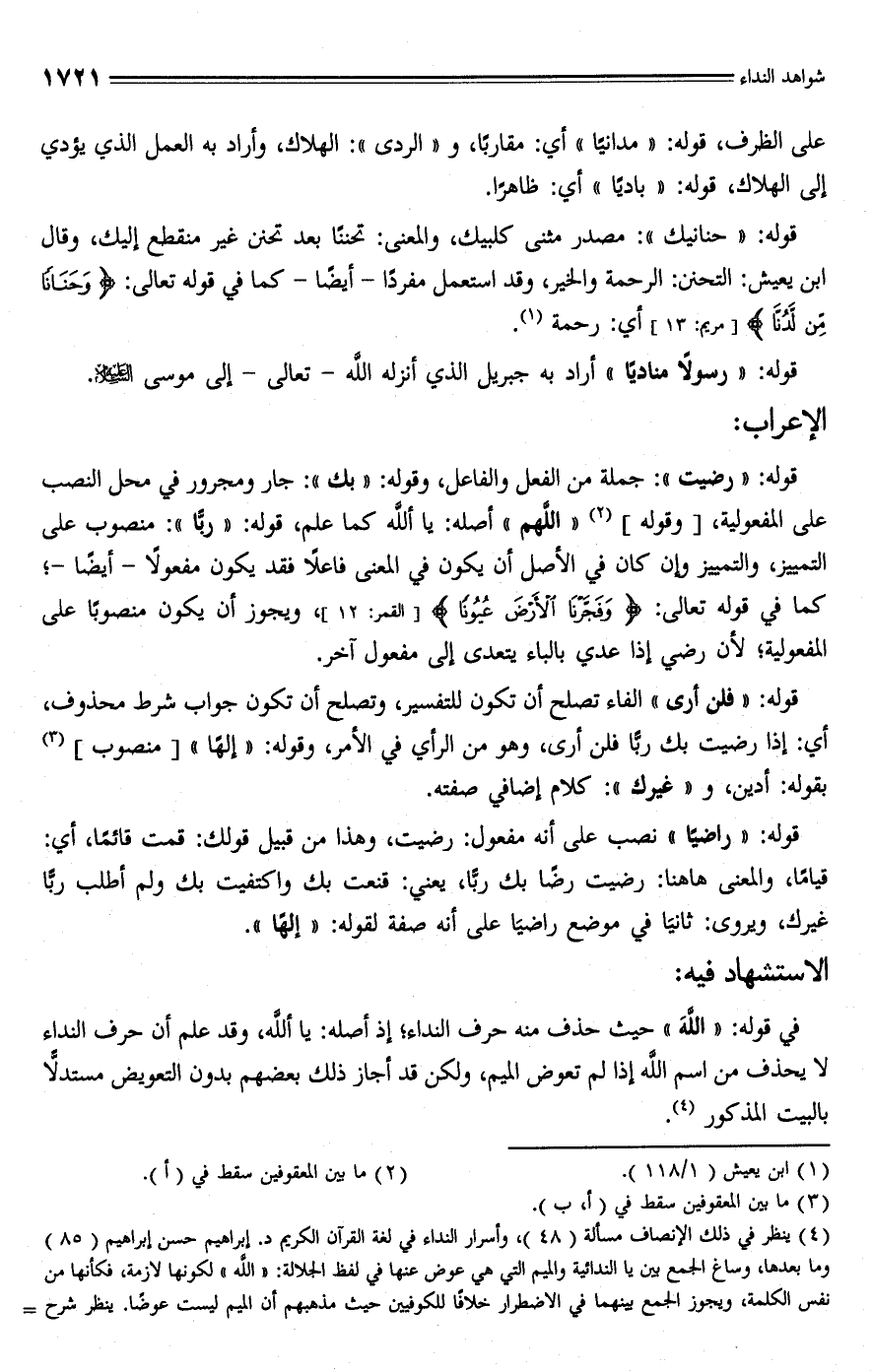 (¬4) ينظر في ذلك الإنصاف مسألة (48)، وأسرار النداء في لغة القرآن الكريم د. إبراهيم حسن إبراهيم (85) وما بعدها، وساغ الجمع بين يا الندائية والميم التي هي عوض عنها في لفظ الجلالة: "الله" لكونها لازمة، فكأنها من نفس الكلمة، ويجوز الجمع بينهما في الاضطرار خلافًا للكوفيين حيث مذهبهم أن الميم ليست عوضًا. ينظر شرح =