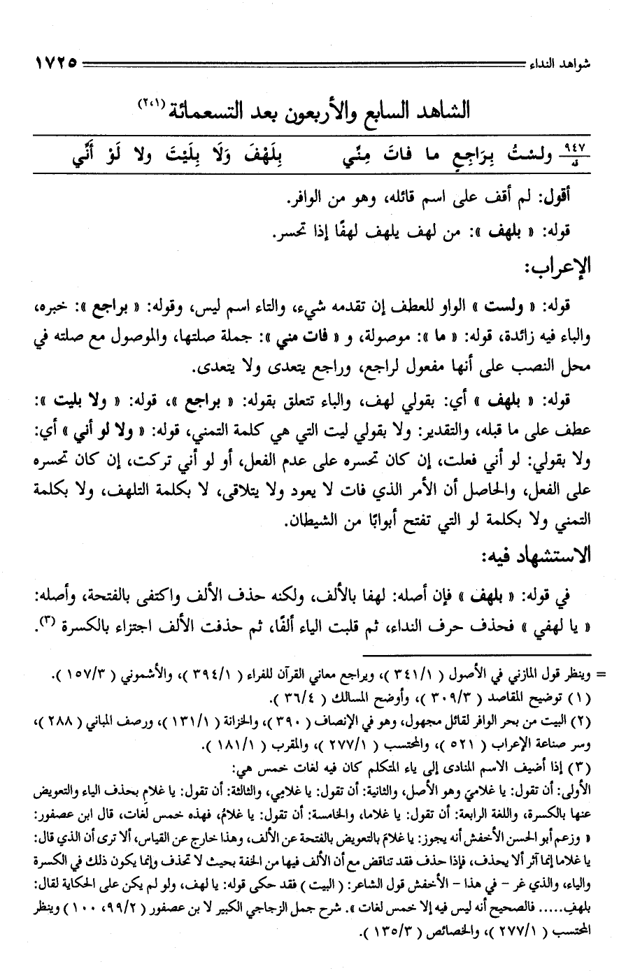 قوله: "بلهف" أي: بقولي لهف، والباء تتعلق بقوله: "براجع"، قوله: "ولا بليت": عطف على ما قبله، والتقدير: ولا بقولي ليت التي هي كلمة التمني، قوله: "ولا لو أني" أي: ولا بقولي: لو أني فعلت، إن كان تحسره على عدم الفعل، أو لو أني تركت، إن كان تحسره على الفعل، والحاصل أن الأمر الَّذي فات لا يعود ولا يتلاقى، لا بكلمة التلهف، ولا بكلمة التمني ولا بكلمة لو التي تفتح أبوابًا من الشيطان.