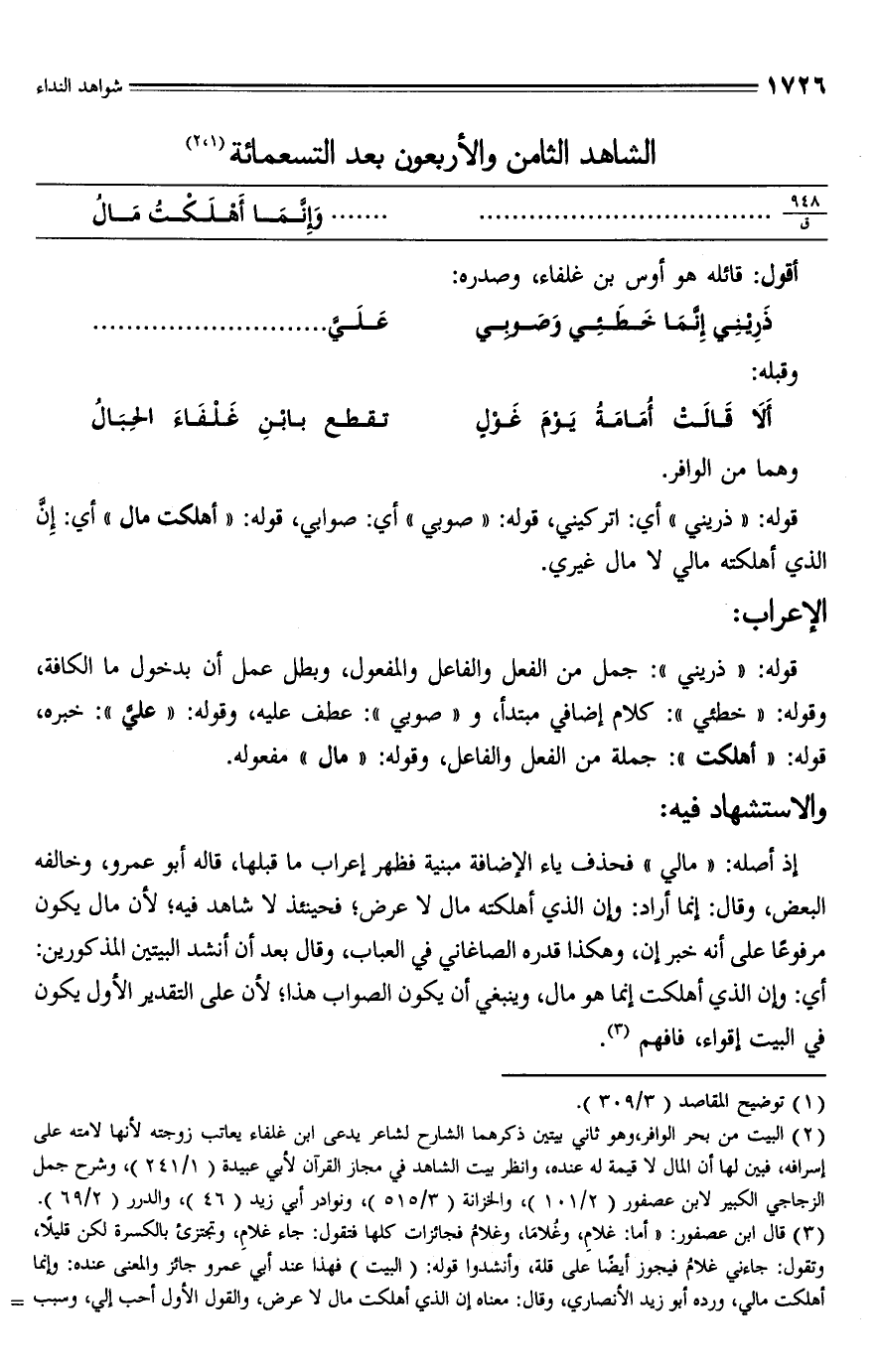 إذ أصله: "مالي" فحذف ياء الإضافة مبنية فظهر إعراب ما قبلها، قاله أبو عمرو، وخالفه البعض، وقال: إنما أراد: وإن الَّذي أهلكته مال لا عرض؛ فحينئذ لا شاهد فيه؛ لأن مال يكون مرفوعًا على أنَّه خبر إن، وهكذا قدره الصاغاني في العباب، وقال بعد أن أنشد البيتين المذكورين: أي: وإن الَّذي أهلكت إنما هو مال، وينبغي أن يكون الصواب هذا، لأن على التقدير الأول يكون في البيت إقواء، فافهم (¬3).
