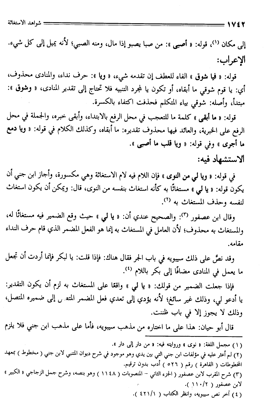 في قوله: "ويا لي من النوى" فإن اللام فيه لام الاستغاثة وهي مكسورة، وأجاز ابن جني أن يكون قوله: "يا لي" مستغاثًا به كأنه استغاث بنفسه من النوى، قال: ويمكن أن يكون استغاث لنفسه وحذف المستغاث به (¬2).