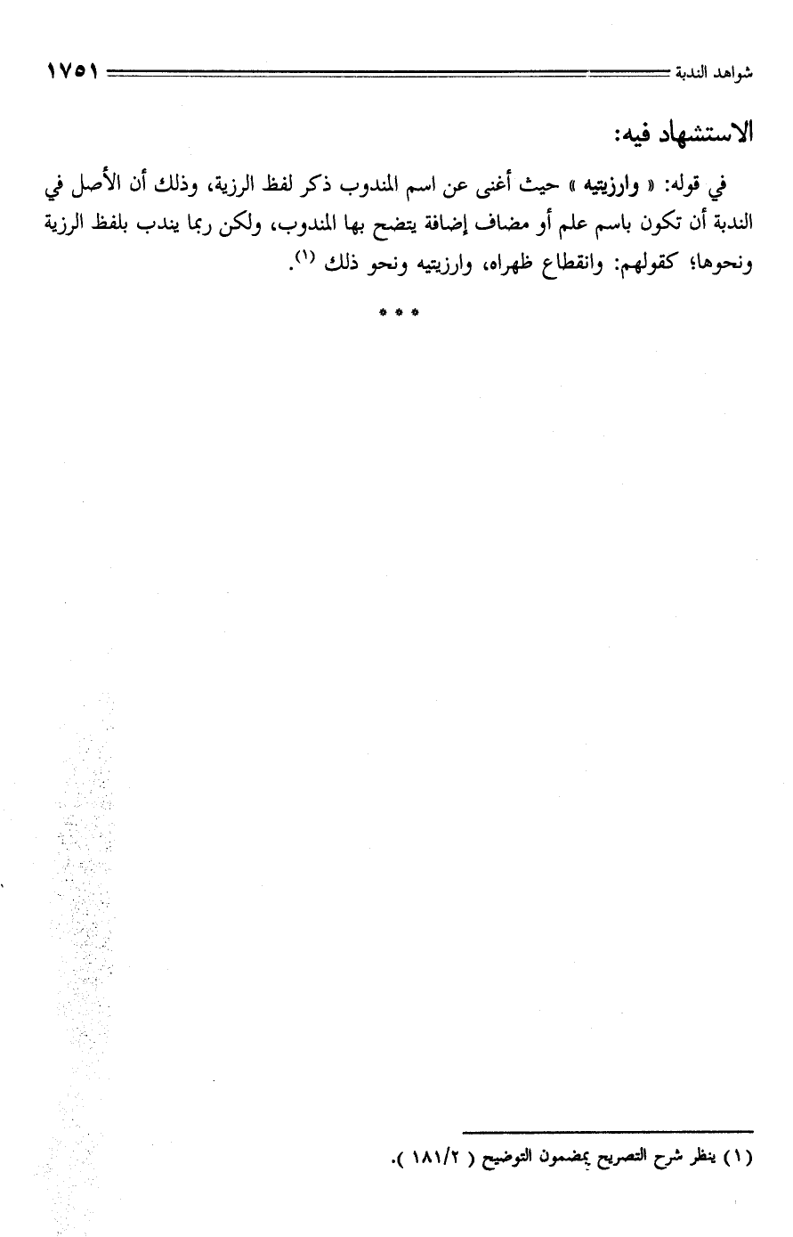 في قوله: "وارزيتيه" حيث أغنى عن اسم المندوب ذكر لفظ الرزية، وذلك أن الأصل في الندبة أن تكون باسم علم أو مضاف إضافة يتضح بها المندوب، ولكن ربما يندب بلفظ الرزية ونحوها؛ كقولهم: وانقطاع ظهراه، وارزيتيه ونحو ذلك (¬1).
