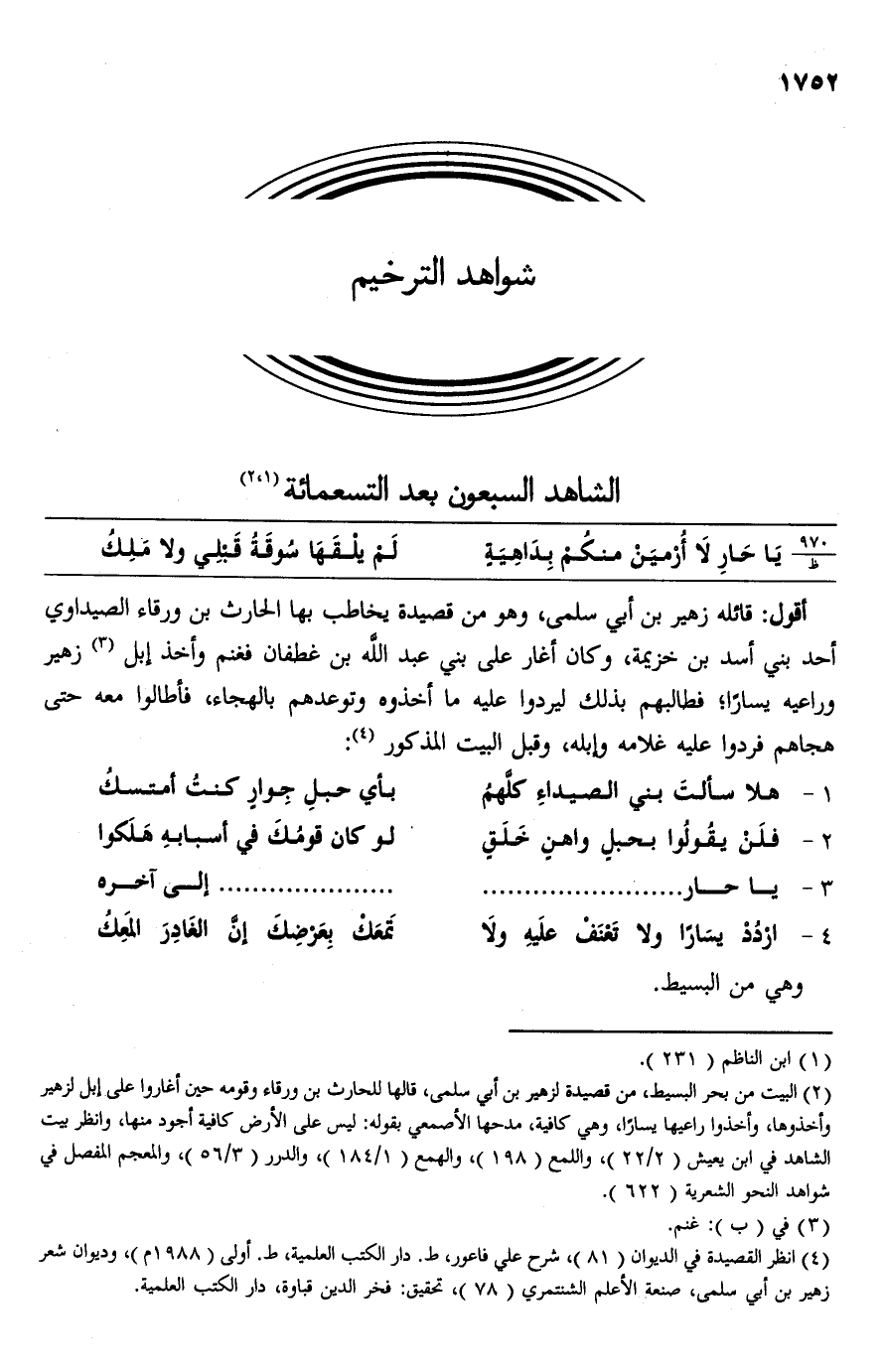 (¬4) انظر القصيدة في الديوان (81)، شرح علي فاعور، ط. دار الكتب العلمية، ط. أولى (1988 م)، وديوان شعر زهير بن أبي سلمى، صنعة الأعلم الشنتمري (78)، تحقيق: فخر الدين قباوة، دار الكتب العلمية.