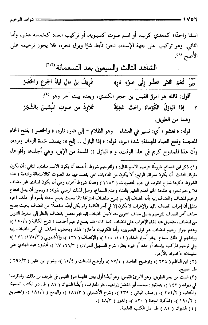 (¬3) البيت من بحر الطويل، وهو لامرئ القيس، وهو أيضًا أول بيتين قالهما امرؤ القيس في طريف بن مالك، وانظرهما في ديوانه (142)، بتحقيق: محمد أبو الفضل إبراهيم، دار المعارف، وأيضًا الديوان (81) ط. دار الكتب العلمية، والكتاب (2/ 254)، ورصف المباني (239)، وشرح الأشموني (3/ 184)، والهمع (1/ 181)، والتصريح (2/ 190)، وتذكرة النحاة (420)، والدرر (3/ 48).