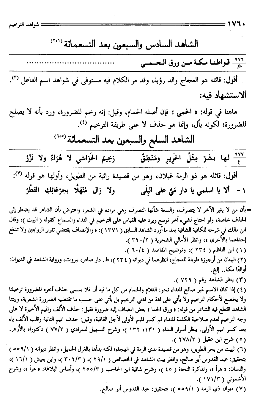 (¬4) إذا كان الاسم غير صالح للنداء نحو: الغلام والحمام من كل ما فيه أل فلا يسمى حذف آخره للضرورة ترخيمًا ولا يخضع لأحكام الترخيم ولا يأتي على لغة من لغتي الترخيم بل يأتي على حسب ما تقتضيه الضرورة الشعرية، وبيتنا الشاهد اقتطع فيه الشاعر من قوله: "ورق الحما" بعض المضاف إليه ضرورة فقيل: حذف الألف والميم الأخيرة لا على وجه الترخيم لعدم صلاحية الكلمة للنداء ثم كسر الميم الأولى لأجل القافية، وقيل: حذف الميم الثانية وقلب الألف ياء بعد كسر الميم الأولى. ينظر أسرار النداء (131، 132)، وشرح التسهيل للمرادي (3/ 77) دكتوراه بالأزهر.