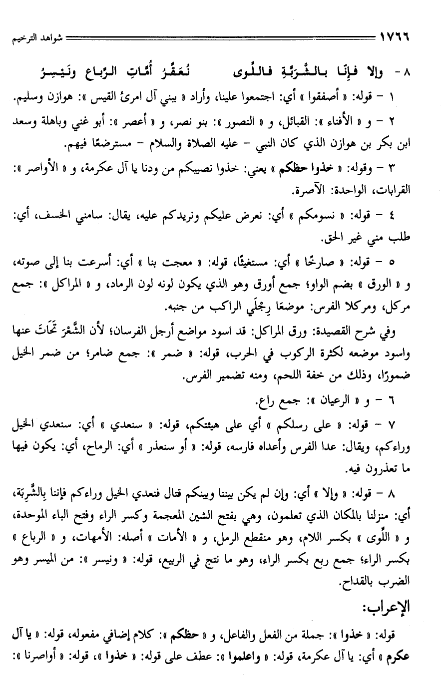 8 - قوله: "وإلا" أي: وإن لم يكن بيننا وبينكم قتال فنعدي الخيل وراءكم فإننا بِالشَّرِبَة، أي: منزلنا بالمكان الذي تعلمون، وهي بفتح الشين المعجمة وكسر الراء وفتح الباء الموحدة، و "اللِّوى" بكسر اللام، وهو منقطع الرمل، و "الأمات" أصله: الأمهات، و "الرباع" بكسر الراء؛ جمع ربع بكسر الراء، وهو ما نتج في الربيع، قوله: "ونيسر": من الميسر وهو الضرب بالقداح.