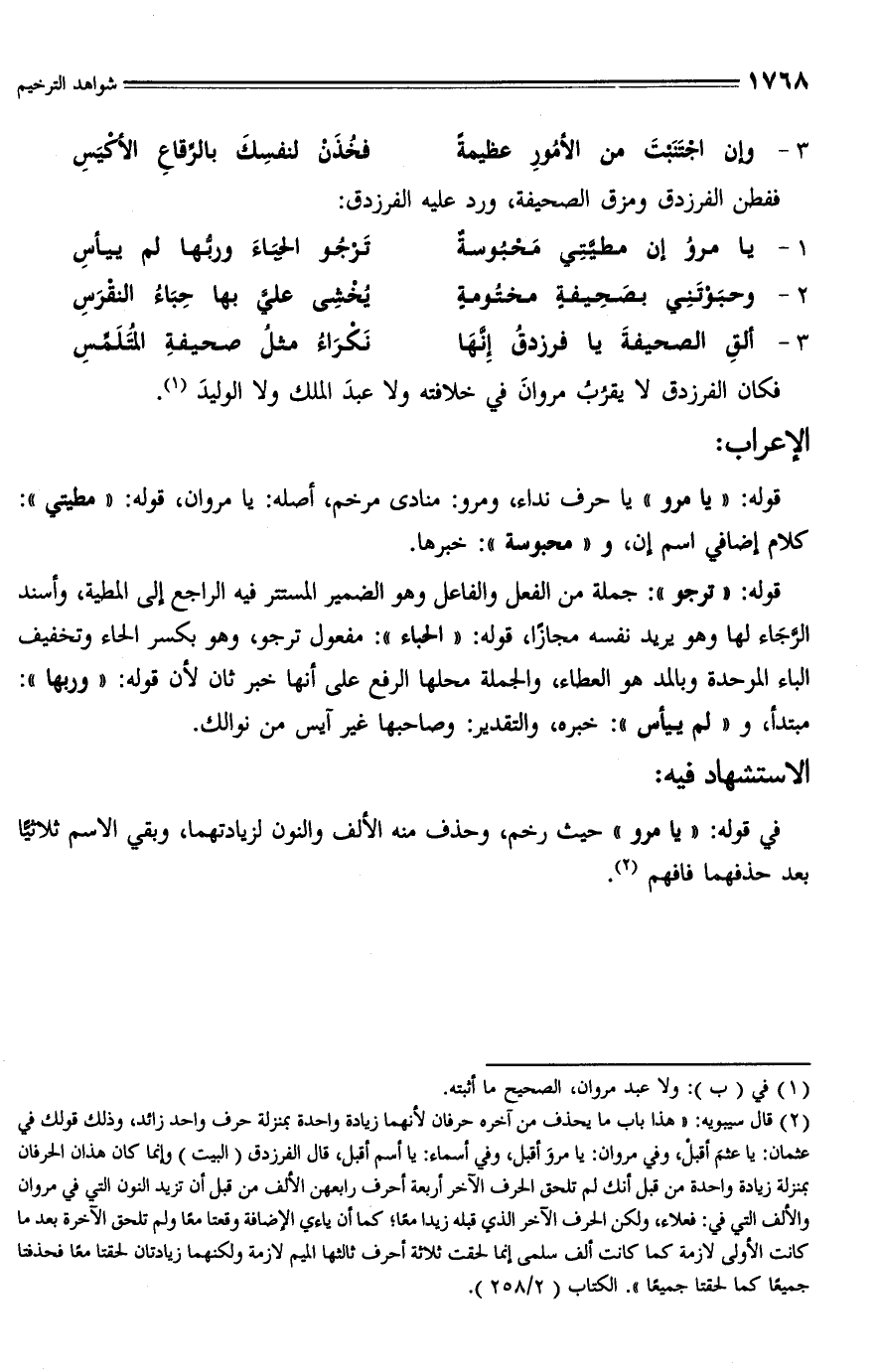 (¬2) قال سيبويه: "هذا باب ما يحذف من آخره حرفان لأنهما زيادة واحدة بمنزلة حرف واحد زائد، وذلك قولك في عثمان: يا عثمَ أقبلْ، وفي مروان: يا مروَ أقبل، وفي أسماء: يا اسم أقبل، قال الفرزدق (البيت) وإنما كان هذان الحرفان بمنزلة زيادة واحدة من قبل أنك لم تلحق الحرف الآخر أربعة أحرف رابعهن الألف من قبل أن تزيد النون التي في مروان والألف التي في: فعلاء، ولكن الحرف الآخر الذي قبله زيدا معًا؛ كما أن ياءي الإضافة وقعتا معًا ولم تلحق الآخرة بعد ما كانت الأولى لازمة كما كانت ألف سلمى إنما لحقت ثلاثة أحرف ثالثها الميم لازمة ولكنهما زيادتان لحقتا معًا فحذفتا جميعًا كما لحقتا جميعًا". الكتاب (2/ 258).