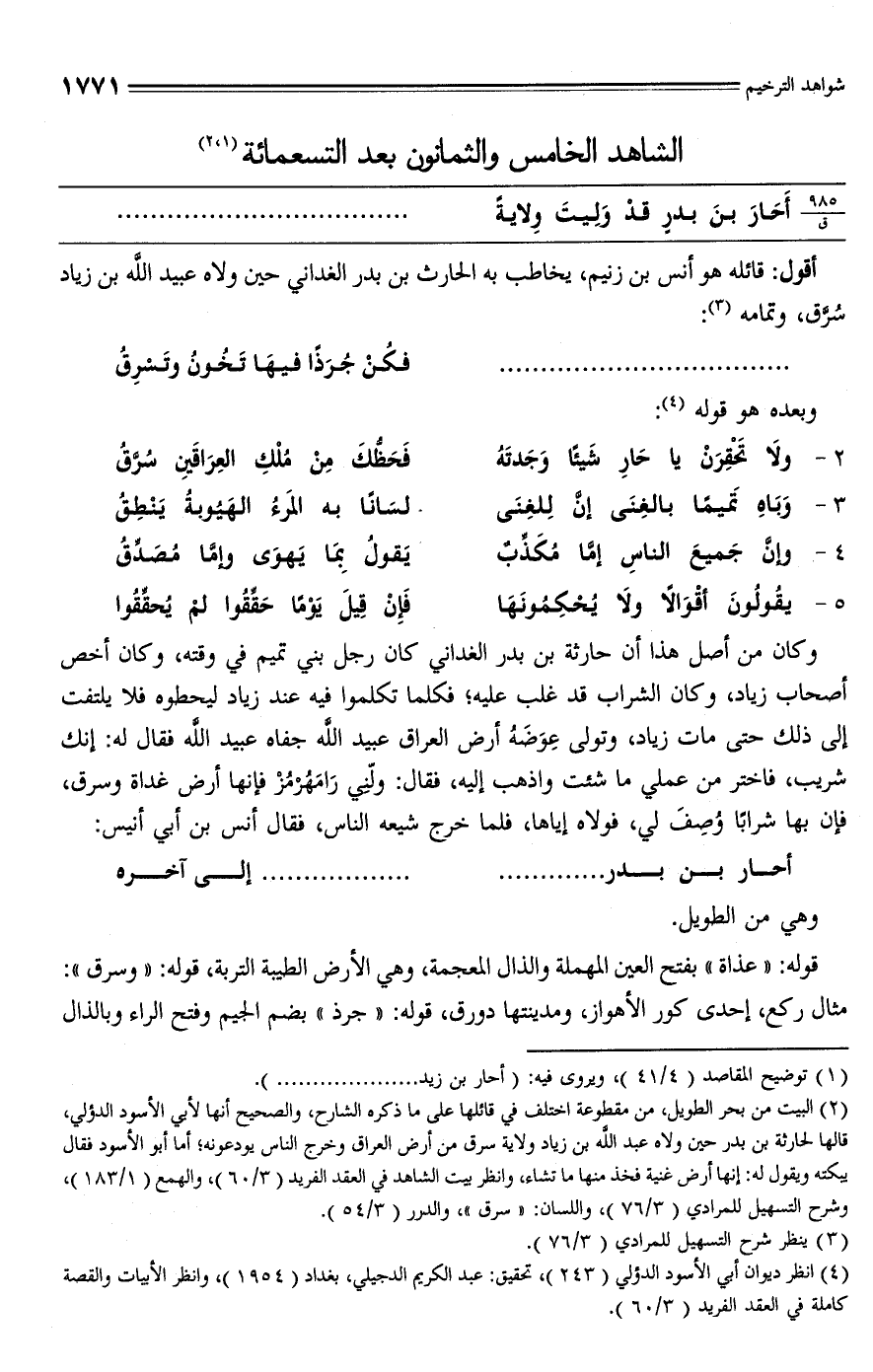 أقول: قائله هو أنس بن زنيم، يخاطب به الحارث بن بدر الغداني حين ولاه عبيد الله بن زياد سُرَّق، وتمامه (¬3):