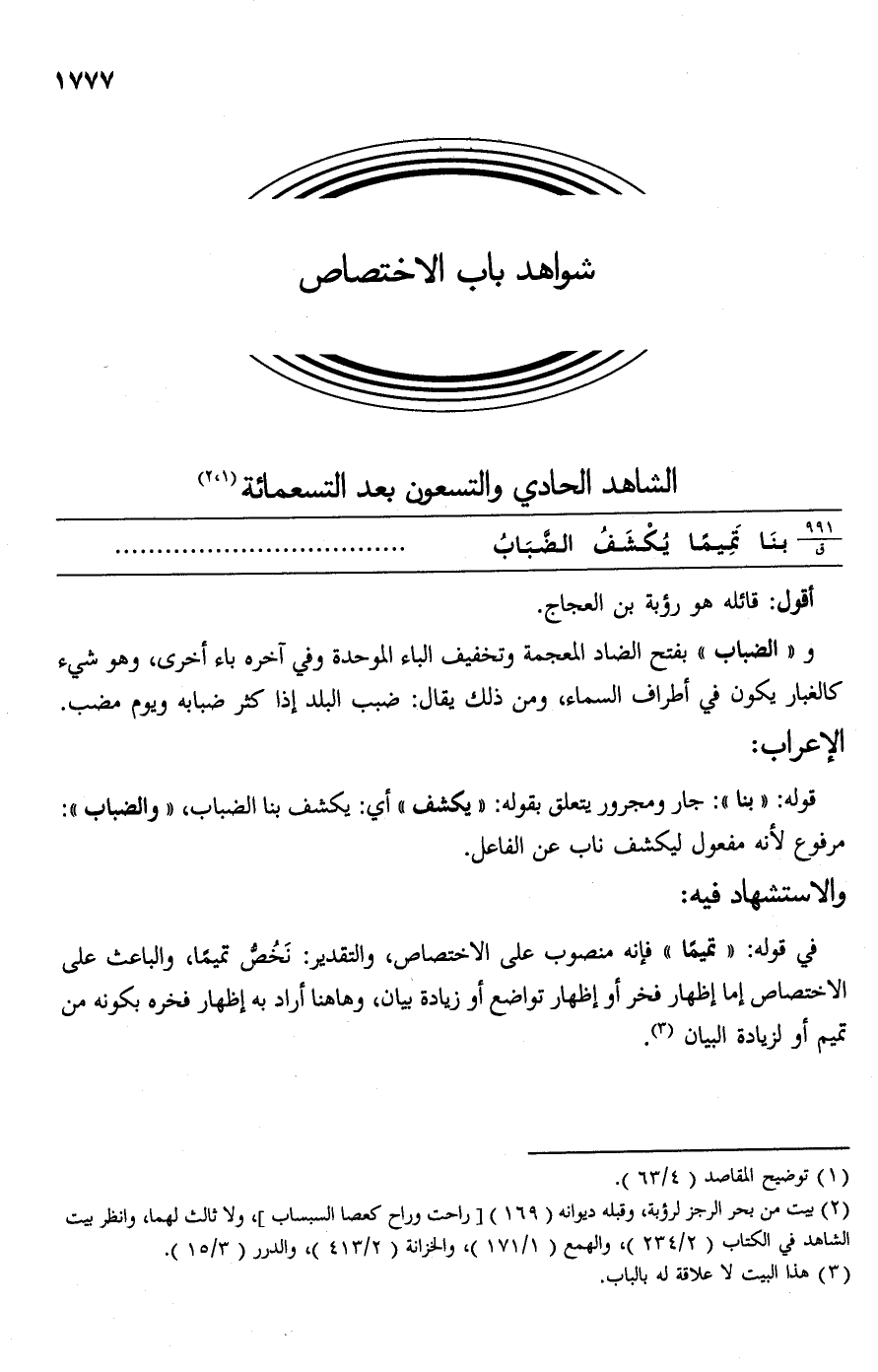 في قوله: "تميمًا" فإنه منصوب على الاختصاص، والتقدير: نَخُصُّ تميمًا، والباعث على الاختصاص إما إظهار فخر أو إظهار تواضع أو زيادة بيان، وهاهنا أراد به إظهار فخره بكونه من تميم أو لزيادة البيان (¬3).