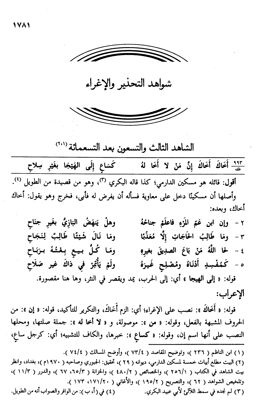 (¬2) البيت مطلع أبيات خمسة لمسكين الدارمي، ديوانه (29)، تحقيق: الجبوري وصاحبه (1970 م)، بغداد، وانظر بيت الشاهد في الكتاب (1/ 256)، والخصائص (2/ 480)، والخزانة (3/ 65، 67)، والدرر (3/ 11)، وتلخيص الشواهد (62)، والتصريح (2/ 195)، والأغاني (20/ 171، 173).