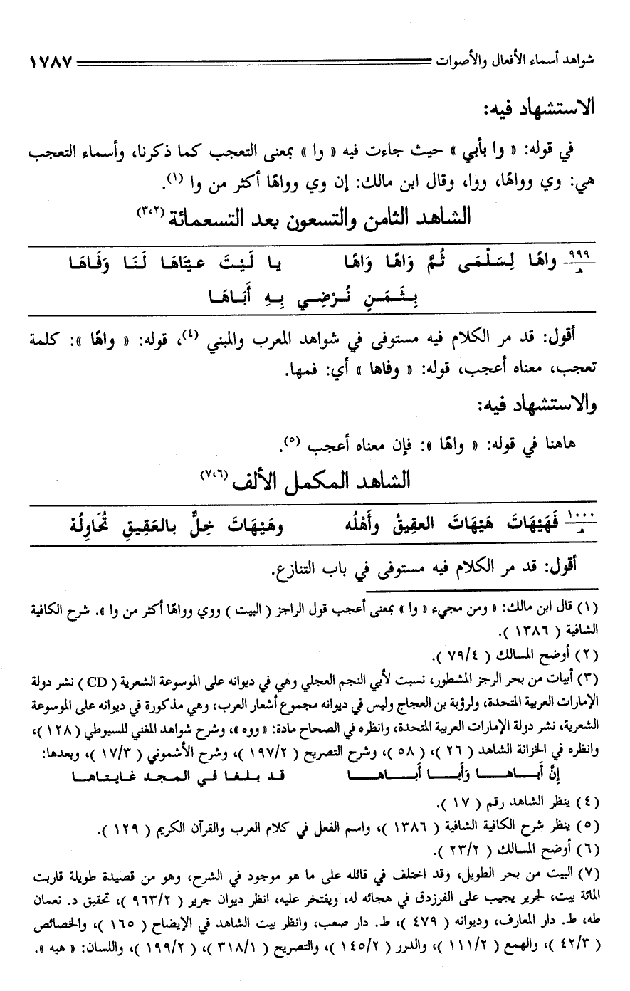 (¬1) قال ابن مالك: "ومن مجيء "وا" بمعنى أعجب قول الراجز (البيت) ووي وواهًا أكثر من وا". شرح الكافية الشافية (1386).