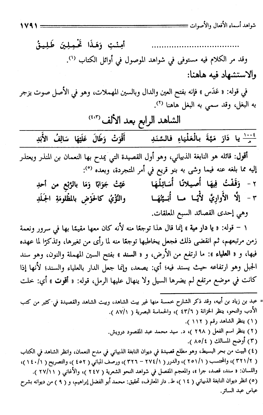 (¬4) البيت من بحر البسيط، وهو مطلع قصيدة في ديوان النابغة الذبياني في مدح النعمان، وانظر الشاهد في الكتاب (2/ 321)، والمحتسب (1/ 251)، والدرر (1/ 274 - 326)، ورصف المباني (452)، والتصريح (1/ 140)، واللسان: "سند" قصد، جرا"، والمعجم المفصل في شواهد النحو الشعرية (247)، والأغاني (11/ 27).