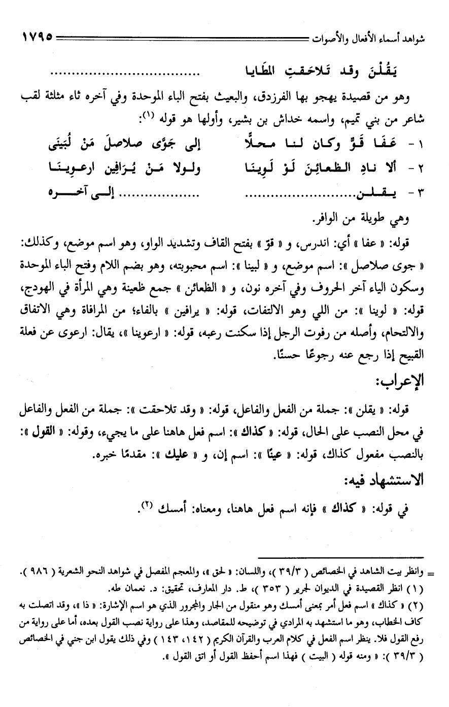 (¬2) "كذاك" اسم فعل أمر بمعنى أمسك وهو منقول من الجار والمجرور الذي هو اسم الإشارة: "ذا"، وقد اتصلت به كاف الخطاب، وهو ما استشهد به المرادي في توضيحه للمقاصد، وهذا على رواية نصب القول بعده، أما على رواية من رفع القول فلا. ينظر اسم الفعل في كلام العرب والقرآن الكريم (142، 143) وفي ذلك يقول ابن جني في الخصائص (3/ 39):) ومنه قوله (البيت) فهذا اسم أحفظ القول أو اتق القول".