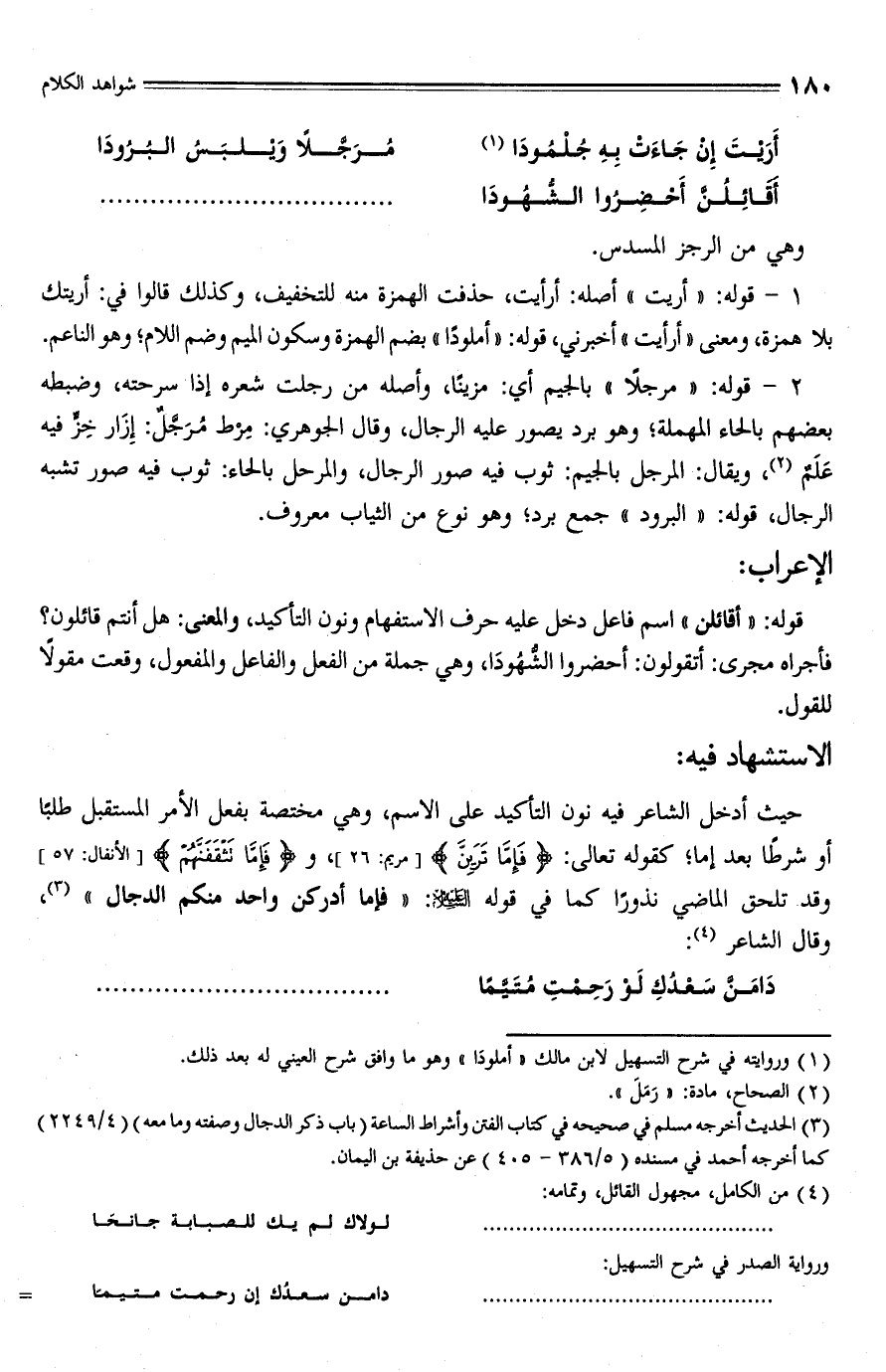 1 - قوله: "أريت" أصله: أرأيت، حذفت الهمزة منه للتخفيف، وكذلك قالوا في: أريتك بلا همزة، ومعنى "أرأيت" أخبرني, قوله: "أملودًا" بضم الهمزة وسكون اليم وضم اللام؛ وهو الناعم.