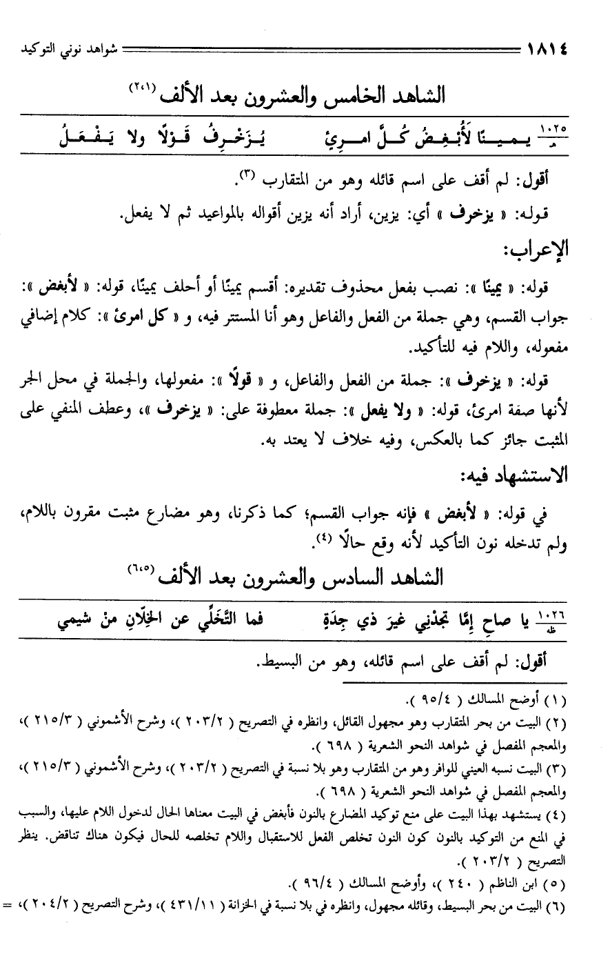 (¬4) يستشهد بهذا البيت على منع توكيد المضارع بالنون فأبغض في البيت معناها الحال لدخول اللام عليها، والسبب في المنع من التوكيد بالنون كون النون تخلص الفعل للاستقبال واللام تخلصه للحال فيكون هناك تناقض. ينظر التصريح (2/ 203).