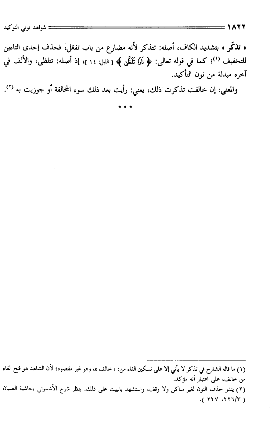 "تذكّر" بتشديد الكاف، أصله: تتذكر لأنه مضارع من باب تفعّل، فحذف إحدى التاءين للتخفيف (¬1)؛ كما في قوله تعالى: {نَارًا تَلَظَّى} [الليل: 14]، إذ أصله: تتلظى، والألف في آخره مبدلة من نون التأكيد.