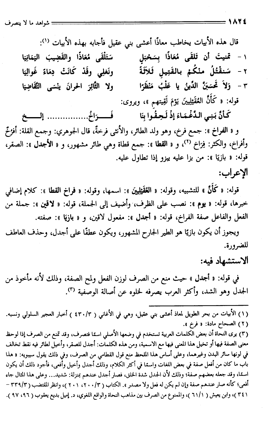 (¬3) يرى النحاة أن بعض الكلمات العربية تستخدم في وضعها الأصلي اسمًا فتصرف، وقد تمنع من الصرف إذا لوحظ معنى الصفة فيها أو تخيل هذا المعنى فيها مع الاسمية، ومن هذه الكلمات: أجدل للصقر، وأخيل لطائر فيه نقط تخالف في لونها سائر البدن وغيرهما، وعلى أساس هذا الملحظ منع قول القطامي من الصرف، وفي ذلك يقول سيبويه: "هذا باب ما كان من أفعل صفة في بعض اللغات واسمًا في أكثر الكلام، وذلك أجدل وأخيل وأفعى، فأجود ذلك أن يكون اسمًا، وقد جعله بعضهم صفة؛ وذلك لأن الجدل شدة الخلق، قصار أجدل عندهم بمنزلة: شديد ... وعلى هذا المثال جاء أفعى؛ كأنه صار عندهم صفة وإن لم يكن له فعل ولا مصدر". الكتاب (3/ 200, 201)، وانظر المقتضب (3/ 339 - 341)، وابن يعيش (1/ 61)، والممنوع من الصرف بين مذاهب النحاة والواقع اللغوي، د. إميل بديع يعقوب (96، 97).