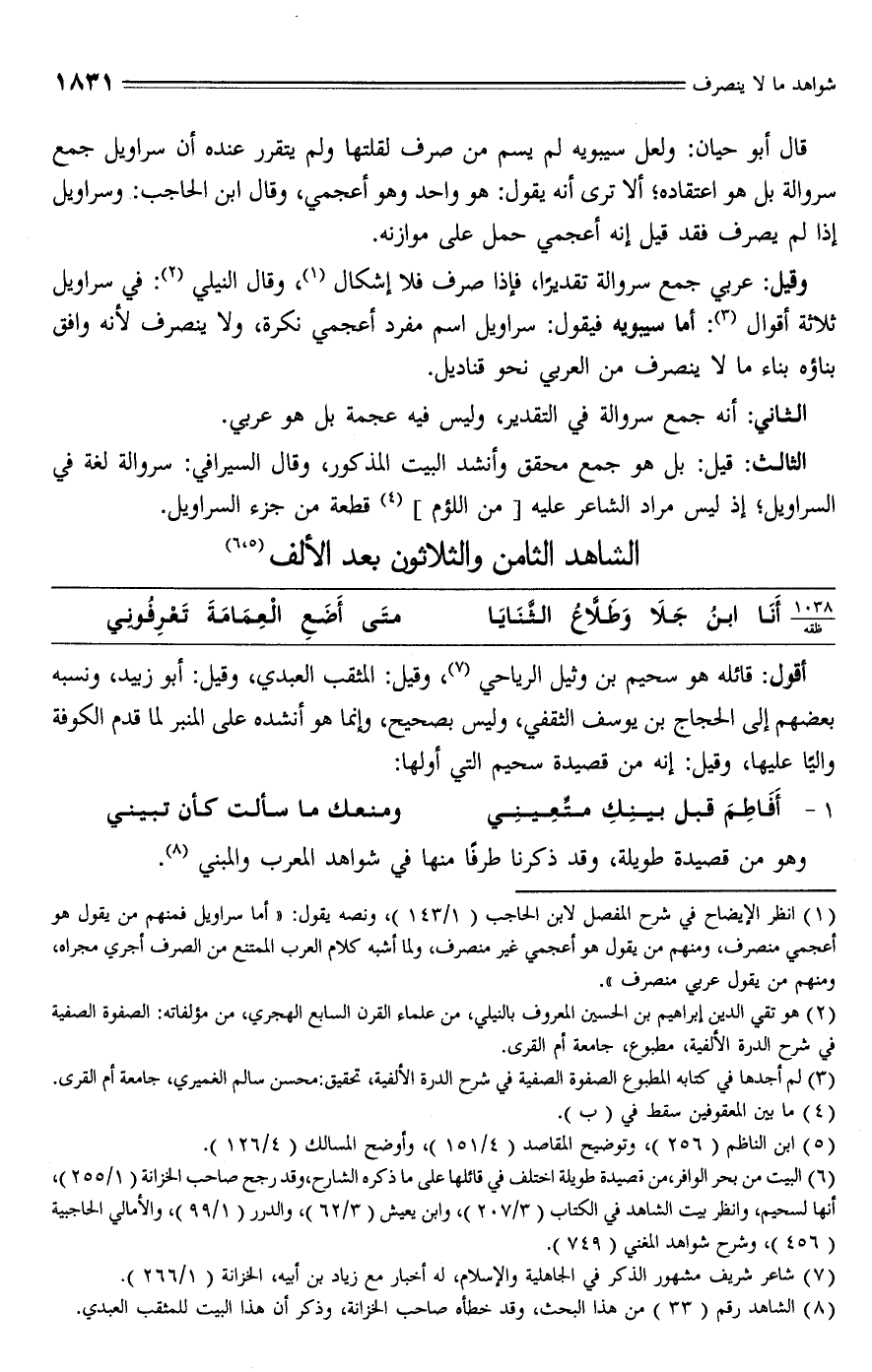 (¬1) انظر الإيضاح في شرح المفصل لابن الحاجب (1/ 143)، ونصه يقول: "أما سراويل فمنهم من يقول هو أعجمي منصرف، ومنهم من يقول هو أعجمي غير منصرف، ولما أشبه كلام العرب الممتنع من الصرف أجري مجراه، ومنهم من يقول عربي منصرف".