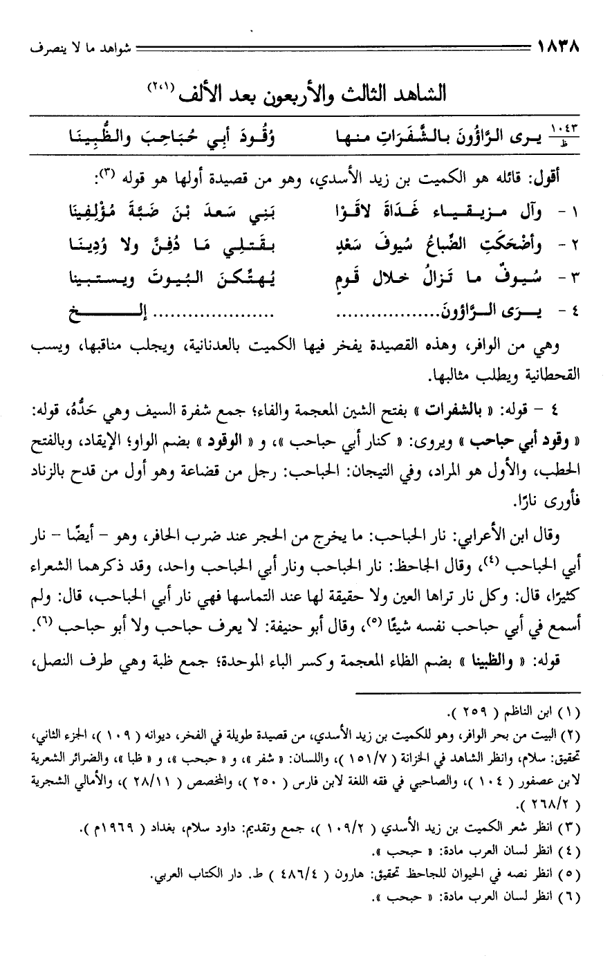 (¬2) البيت من بحر الوافر، وهو للكميت بن زيد الأسدي، من قصيدة طويلة في الفخر، ديوانه (109)، الجزء الثاني، تحقيق: سلام، وانظر الشاهد في الخزانة (7/ 151)، واللسان: "شفر"، و"حبحب"، و"ظبا"، والضرائر الشعرية لابن عصفور (104)، والصاحبي في فقه اللغة لابن فارس (250)، والمخصص (11/ 28)، والأمالي الشجرية (2/ 268).
