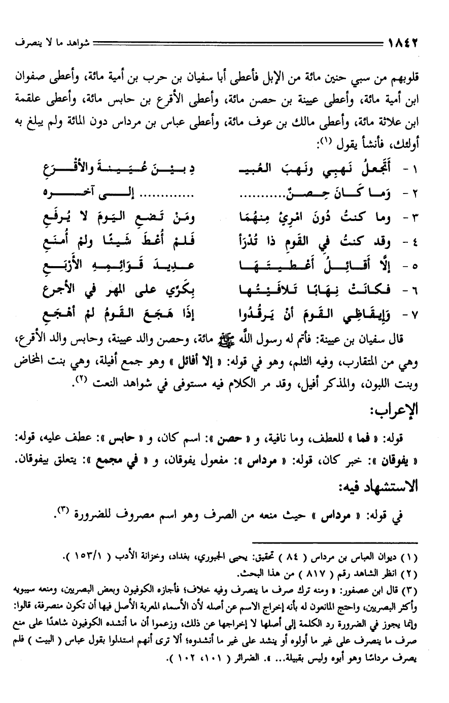 (¬3) قال ابن عصفور: "ومنه ترك صرف ما ينصرف وفيه خلاف؛ فأجازه الكوفيون وبعض البصريين، ومنعه سيبويه وأكثر البصريين، واحتج المانعون له بأنه إخراج الاسم عن أصله لأن الأسماء المعربة الأصل فيها أن تكون منصرفة، قالوا: وإنما يجوز في الضرورة رد الكلمة إلى أصلها لا إخراجها عن ذلك، وزعموا أن ما أنشده الكوفيون شاهدًا على منع صرف ما ينصرف على غير ما أولوه أو ينشد على غير ما أنشدوه؛ ألا ترى أنهم استدلوا بقول عباس (البيت) فلم يصرف مرداسًا وهو أبوه وليس بقبيلة ... ". الضرائر (101، 102).