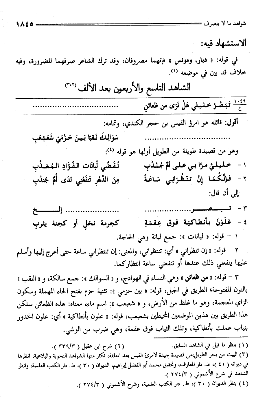 (¬3) البيت من بحر الطويل، من قصيدة جيدة لامرئ القيس بعد المعلقة، تكثر منها الشواهد النحوية والبلاغية، انظرها في ديوانه (41)، ط. دار المعارف، وتحقيق محمد أبو الفضل إبراهيم، الديوان (30)، ط. دار الكتب العلمية، وانظر الشاهد في شرح الأشموني (3/ 274).