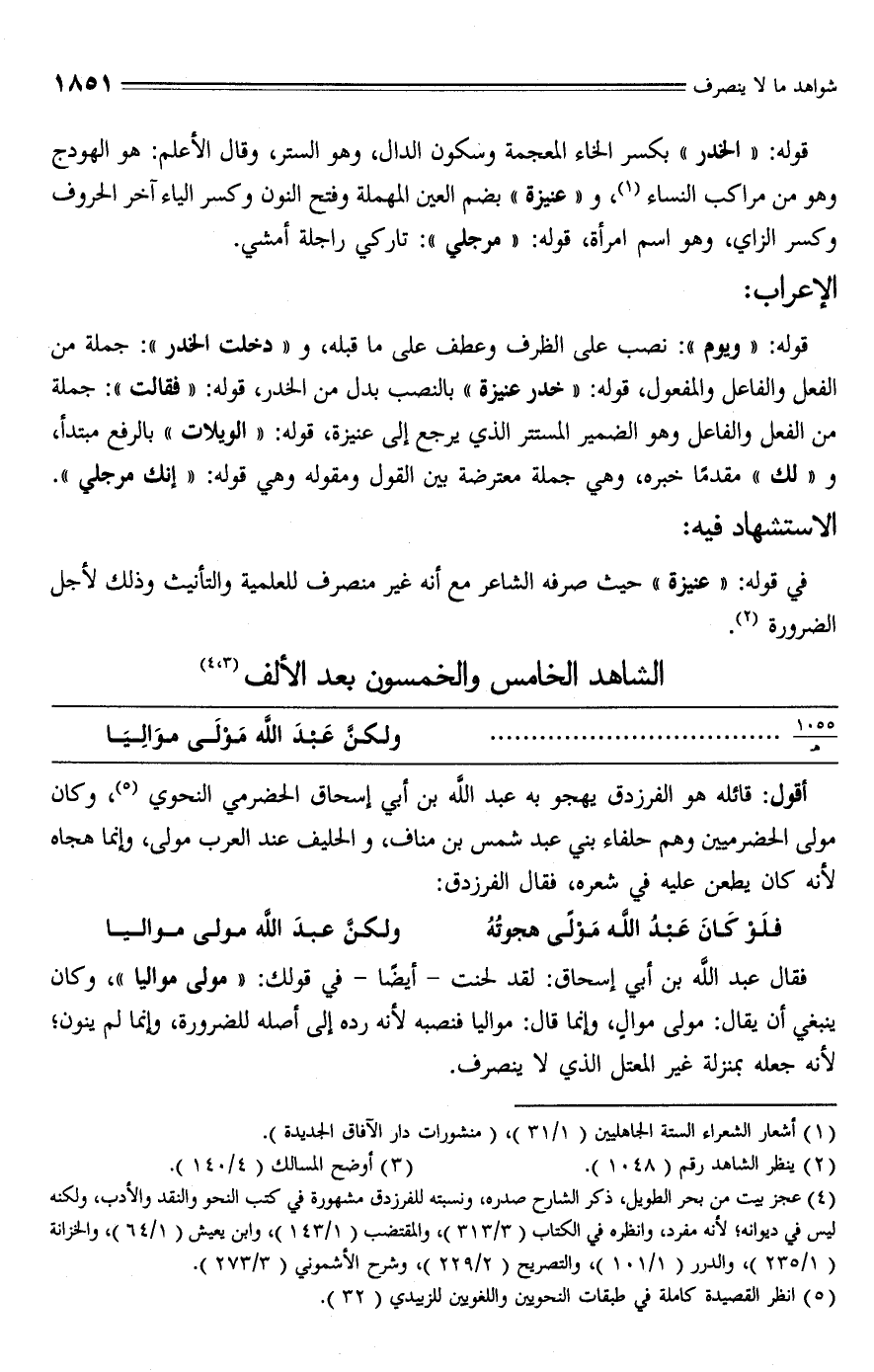 في قوله: "عنيزة" حيث صرفه الشاعر مع أنه غير منصرف للعلمية والتأنيث وذلك لأجل الضرورة (¬2).