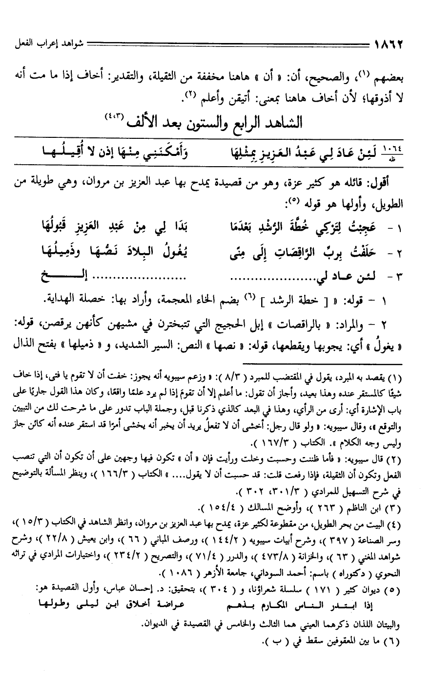 (¬4) البيت من بحر الطويل، من مقطوعة لكثير عزة، يمدح بها عبد العزيز بن مروان، وانظر الشاهد في الكتاب (3/ 15)، وسر الصناعة (397)، وشرح أبيات سيبويه (2/ 144)، ورصف المباني (66)، وابن يعيش (8/ 22)، وشرح شواهد المغني (63)، والخزانة (8/ 473)، والدرر (4/ 71)، والتصريح (2/ 234)، واختيارات المرادي في تراثه النحوي (دكتوراه) باسم: أحمد السوداني، جامعة الأزهر (1086).