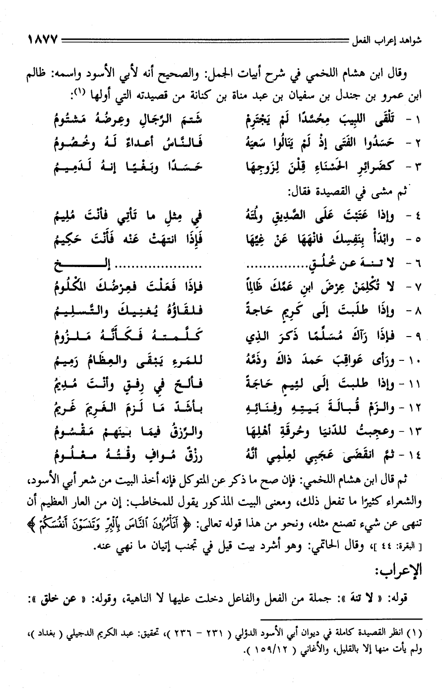 (¬1) انظر القصيدة كاملة في ديوان أبي الأسود الدؤلي (231 - 236)، تحقيق: عبد الكريم الدجيلي (بغداد)، ولم يأت منها إلا بالقليل، والأغاني (12/ 159).