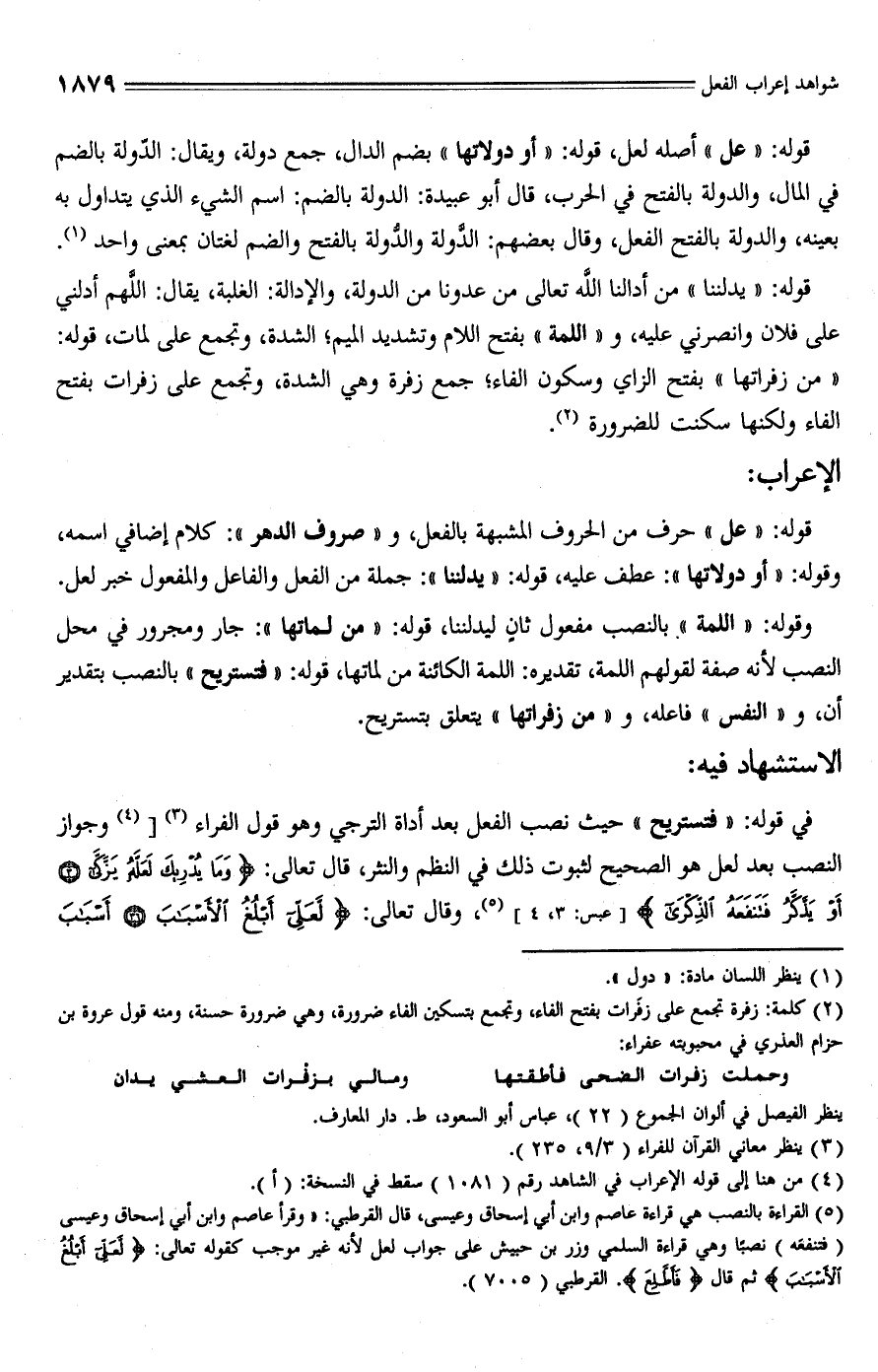 قوله: "عل" حرف من الحروف المشبهة بالفعل، و "صروف الدهر": كلام إضافي اسمه، وقوله: "أو دولاتها": عطف عليه، قوله: "يدلننا": جملة من الفعل والفاعل والمفعول خبر لعل.