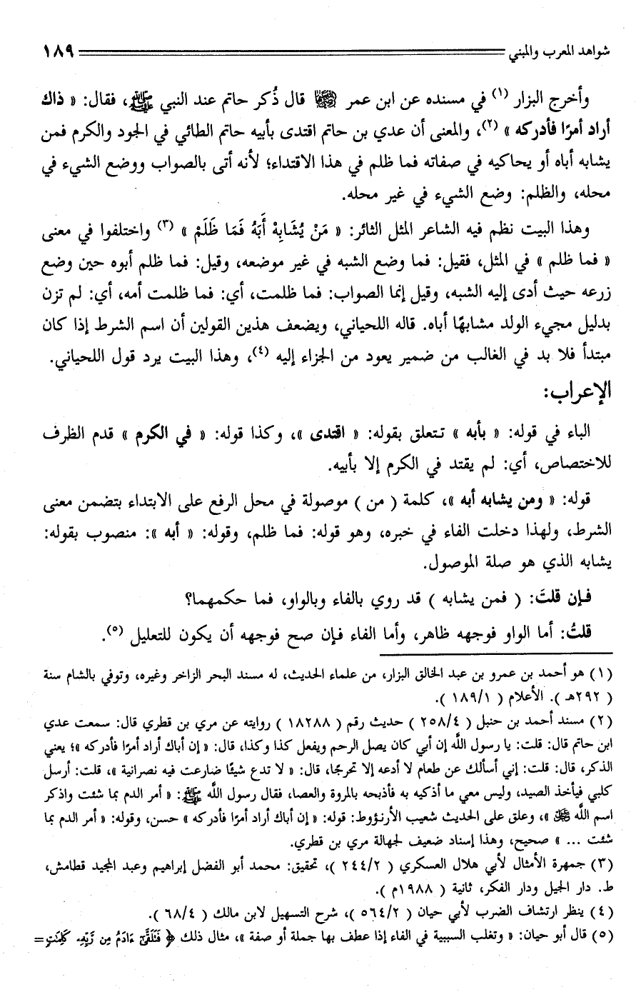 وأخرج البزار (¬1) في مسنده عن ابن عمر - رضي الله عنهما - قال ذُكر حاتم عند النبي - صلى الله عليه وسلم -، فقال: "ذاك أراد أمرًا فأدركه" (¬2)، والمعنى أن عدي بن حاتم اقتدى بأبيه حاتم الطائي في الجود والكرم فمن يشابه أباه أو يحاكيه في صفاته فما ظلم في هذا الاقتداء؛ لأنه أتى بالصواب ووضع الشيء في محله، والظلم: وضع الشيء في غير محله.
