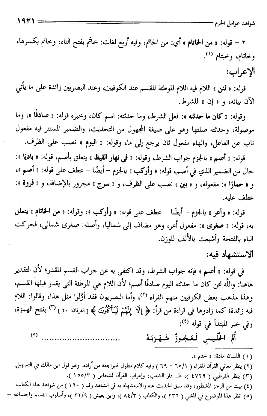 في قوله: "أصم" فإنَّه جواب الشرط، وقد اكتفى به عن جواب القسم المقدر؛ لأن التقدير ها هنا: والله لئن كان ما حدثته اليوم صادقًا أصم؛ لأن اللام هي الموطئة التي يقدر قبلها القسم، وهذا مذهب بعض الكوفيين منهم الفراء (¬2)، وأما البصريون فقد أوَّلوا مثل هذا، وقالوا: اللام فيه زائدة، كما زادوها في قراءة من قرأ: {إلا إِنَّهُمْ لَيَأْكُلُونَ} [الفرقان: 20] (¬3) بفتح الهمزة، وفي خبر المبتدأ في قوله (¬4):