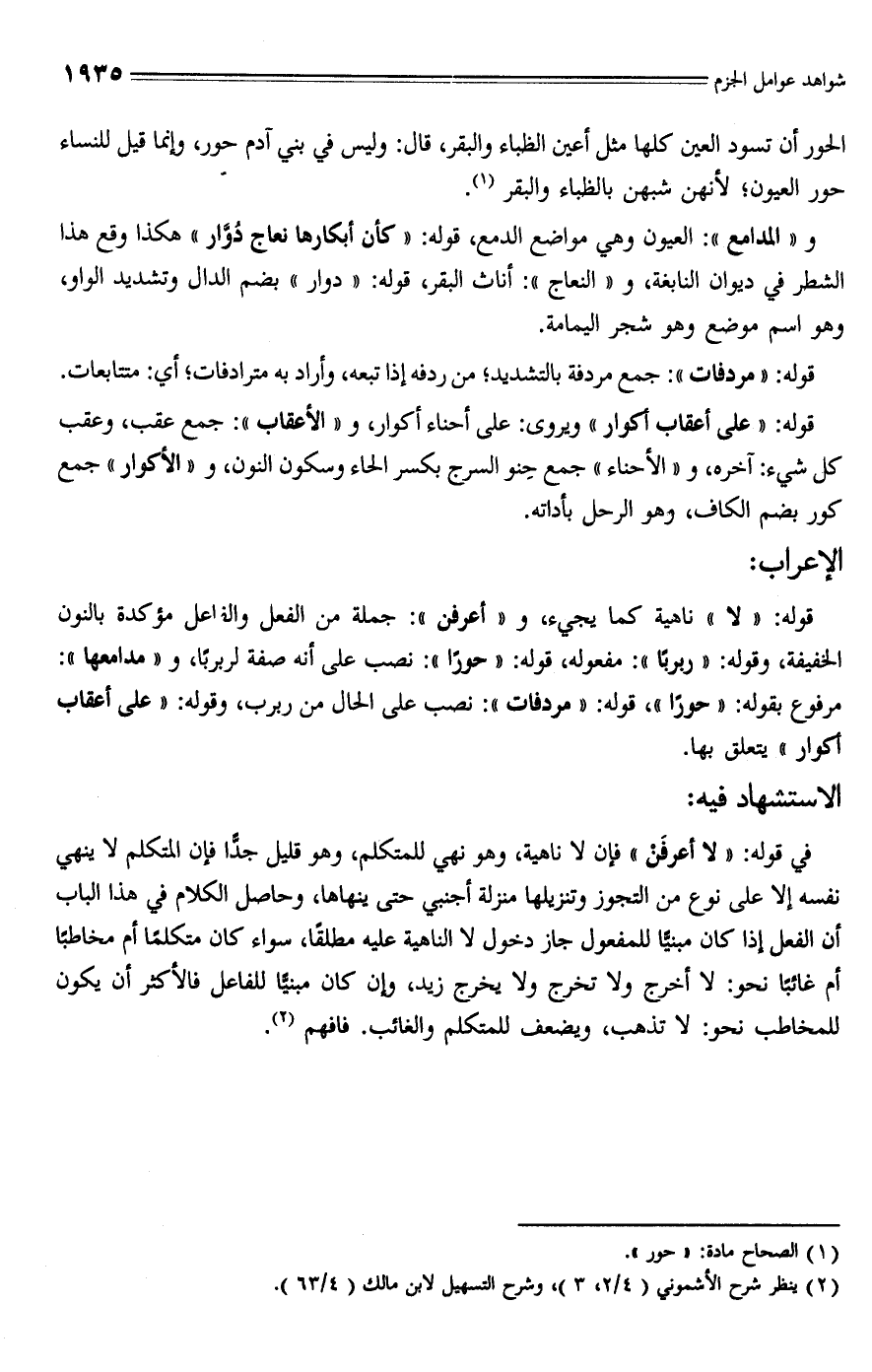 قوله: "لا" ناهية كما يجيء، و"أعرفن": جملة من الفعل والفاعل مؤكدة بالنُّون الخفيفة، وقوله: "ربربًا": مفعوله، قوله: "حورًا": نصب على أنَّه صفة لربربًا، و" مدامعها": مرفوع بقوله: "حورًا"، قوله: "مردفات": نصب على الحال من ربرب، وقوله: "على أعقاب أكوار" يتعلق بها.