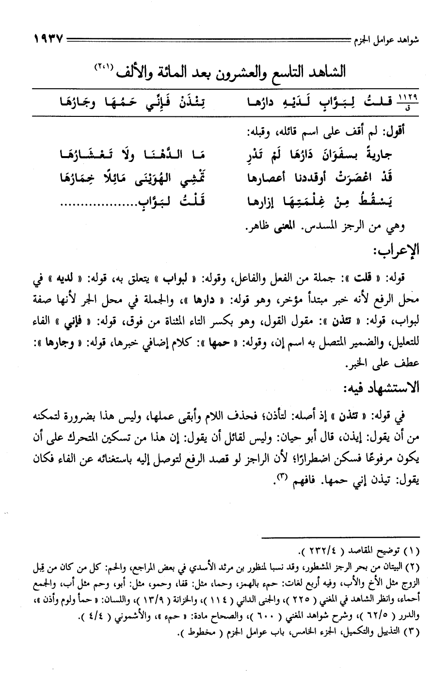 (¬2) البيتان من بحر الرجز المشطور، وقد نسبا لمنظور بن مرثد الأسدي في بعض المراجع، والحم: كل من كان من قِبل الزوج مثل الأخ والأب، وفيه أربع لغات: حمء بالهمز، وحما، مثل: قفا، وحمو، مثل: أبو، وحم مثل أب، والجمع أسماء، وانظر الشاهد في المغني (225)، والجنى الداني (114)، والخزانة (9/ 13)، واللسان: "حمأ ولوم وأذن"، والدرر (5/ 62)، وشرح شواهد المغني (600)، والصحاح مادة: "حمء"، والأشموني (4/ 4).