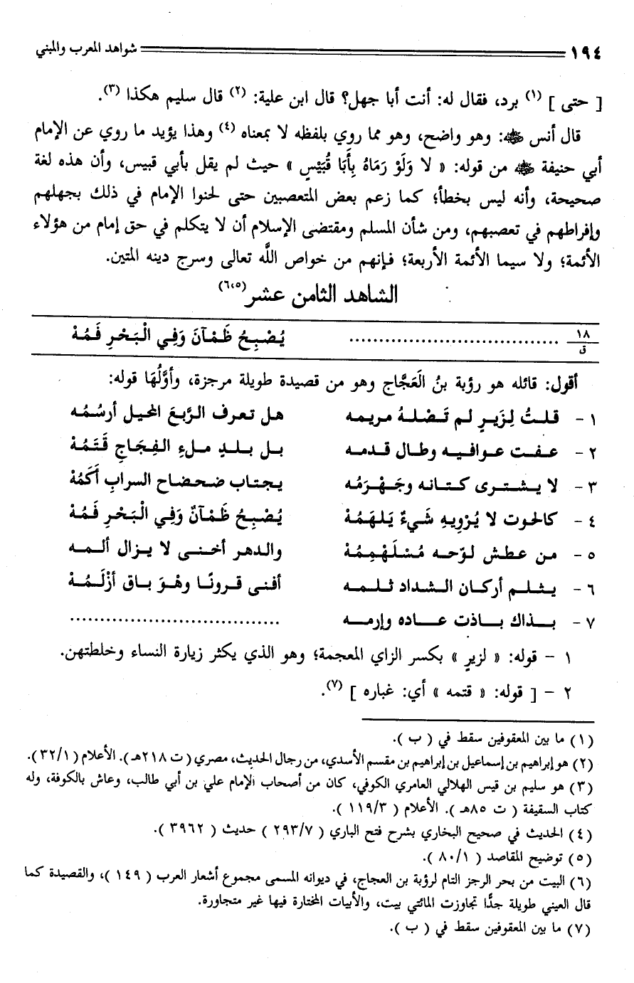 (¬6) البيت من بحر الرجز التام لرؤبة بن العجاج، في ديوانه المسمى مجموع أشعار العرب (149)، والقصيدة كما قال العيني طويلة جدا تجاوزت المائتي بيت، والأبيات المختارة فيها غير متجاورة.
