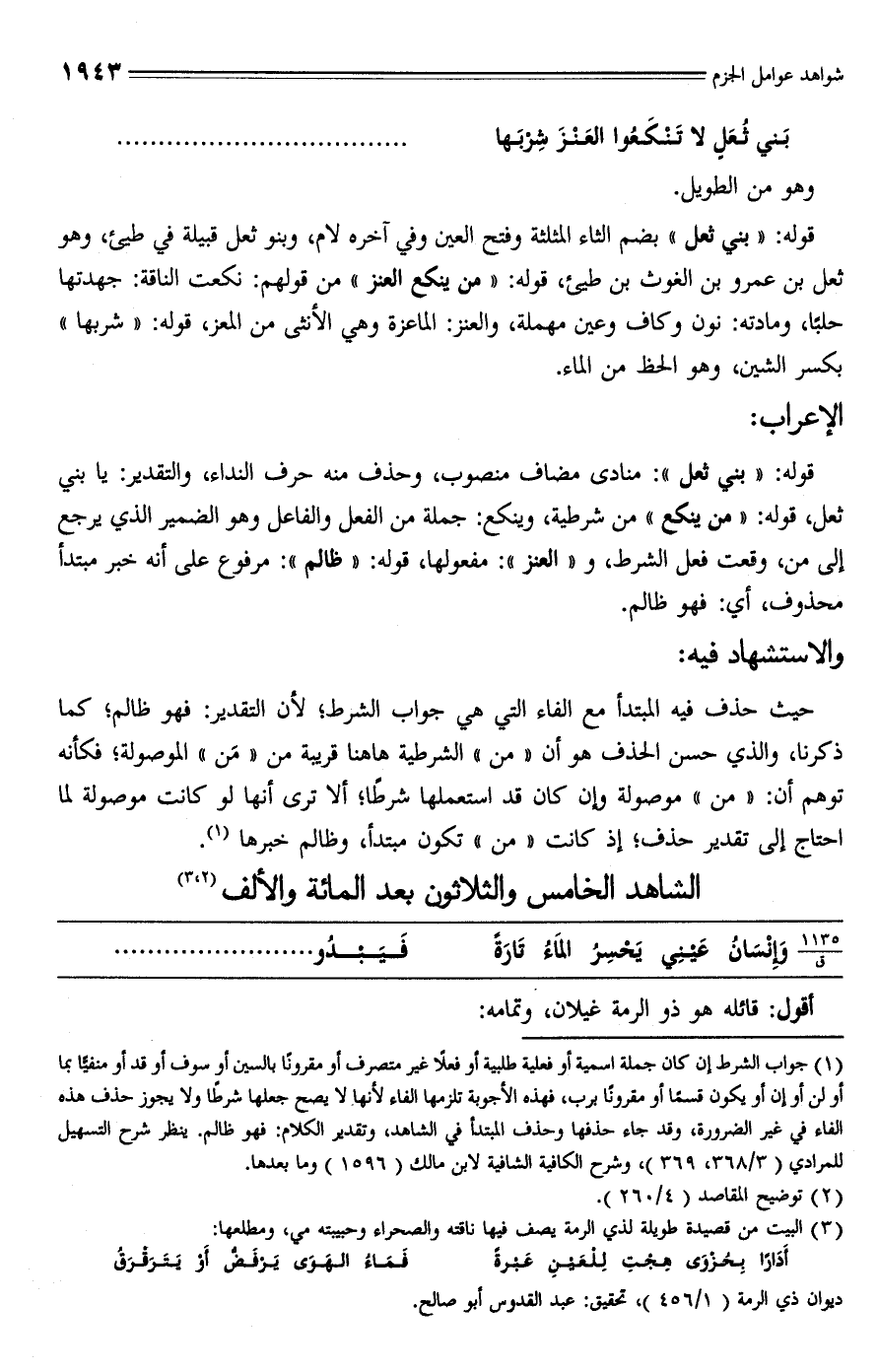 (¬1) جواب الشرط ان كان جملة اسمية أو فعلية طلبية أو فعلًا غير متصرف أو مقرونًا بالسين أو سوف أو قد أو منفيًّا بما أو لن أو إن أو يكون قسمًا أو مقرونًا برب، فهذه الأجوبة تلزمها الفاء لأنها لا يصح جعلها شرطًا ولا يجوز حذف هذه الفاء في غير الضرورة، وقد جاء حذفها وحذف المبتدأ في الشاهد، وتقدير الكلام: فهو ظالم. ينظر شرح التسهيل للمرادي (3/ 368، 369)، وشرح الكافية الشافية لابن مالك (1596) وما بعدها.