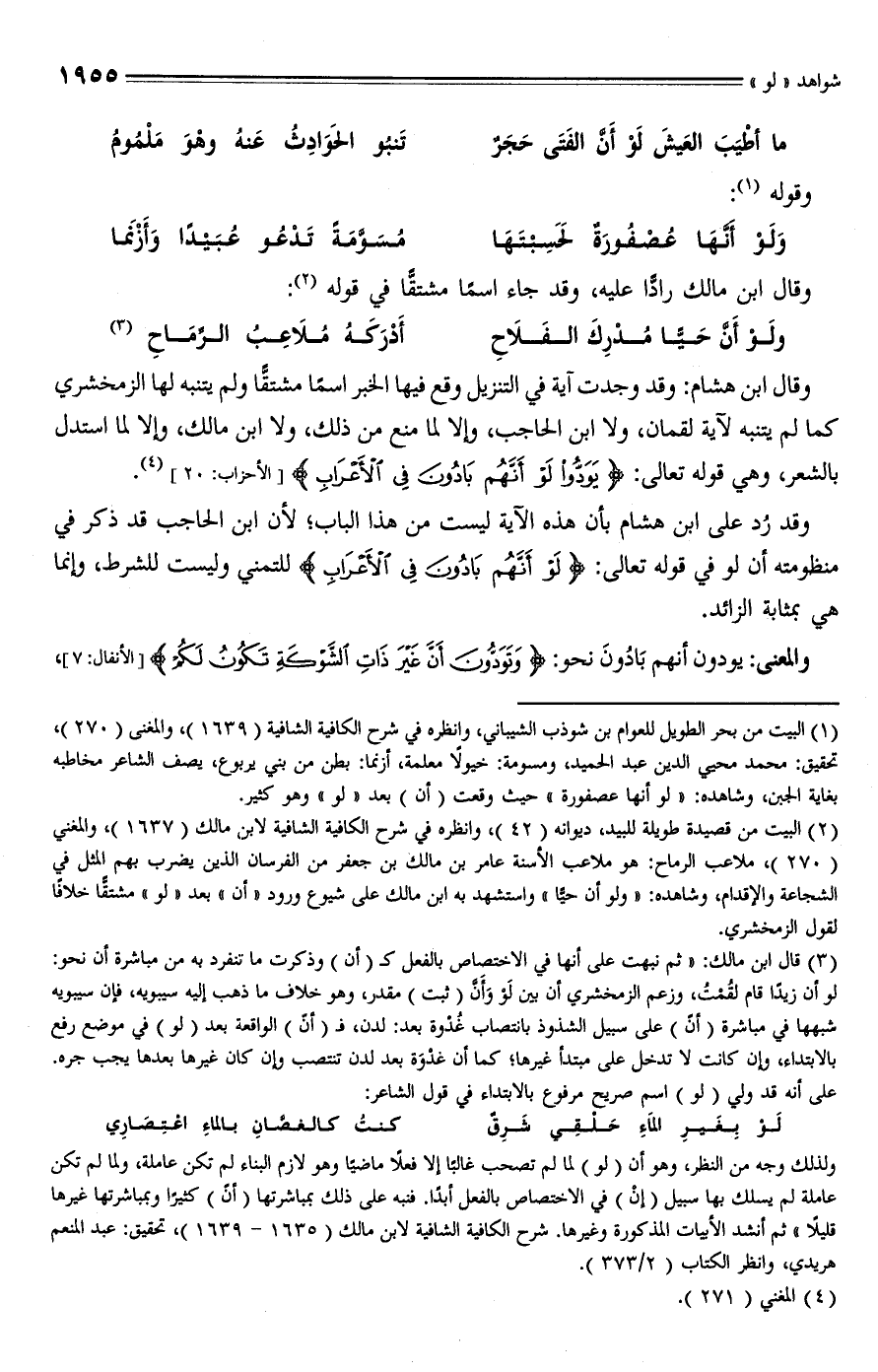 (¬2) البيت من قصيدة طويلة للبيد، ديوانه (42)، وانظره في شرح الكافية الشافية لابن مالك (1637)، والمغني (270)، ملاعب الرماح: هو ملاعب الأسنة عامر بن مالك بن جعفر من الفرسان الذين يضرب بهم المثل في الشجاعة والإقدام، وشاهده: "ولو أن حيًّا" واستشهد به ابن مالك على شيوع ورود "أن" بعد "لو" مشتقًّا خلافًا لقول الزمخشري.