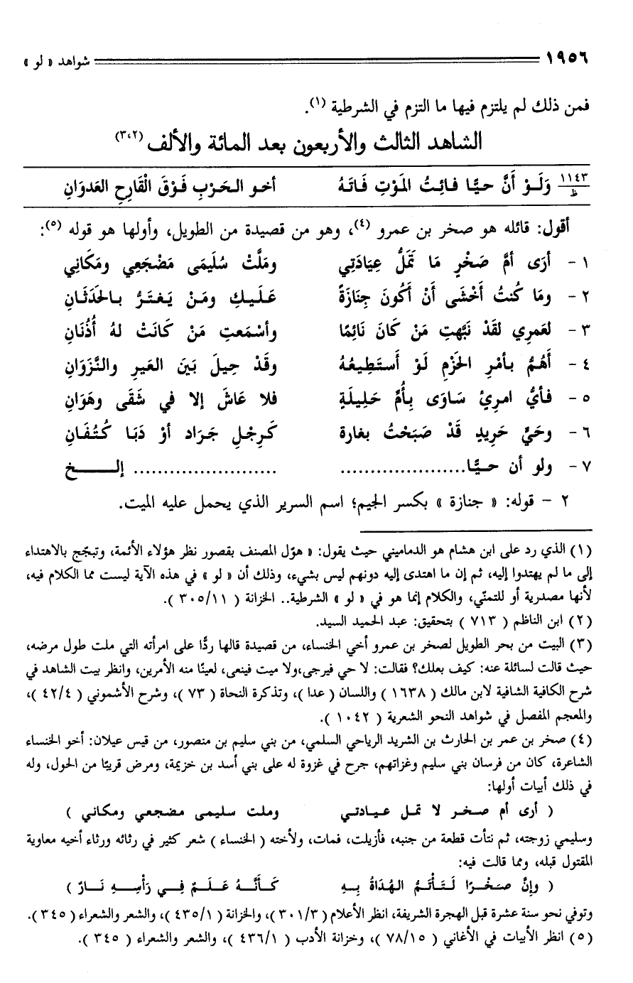 (¬3) البيت من بحر الطويل لصخر بن عمرو أخي الخنساء، من قصيدة قالها ردًّا على امرأته التي ملت طول مرضه، حيث قالت لسائلة عنه: كيف بعلك؟ فقالت: لا حي فيرجى، ولا ميت فينعى، لعينًا منه الأمرين، وانظر بيت الشاهد في شرح الكافية الشافية لابن مالك (1638) واللسان (عدا)، وتذكرة النحاة (73)، وشرح الأشموني (4/ 42)، والمعجم المفصل في شواهد النحو الشعرية (1042).