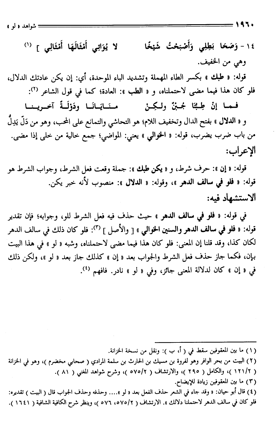 (¬4) قال أبو حيان: "وقد جاء في الشعر حذف الفعل بعد "لو" .... وحذفه وحذف الجواب قال (البيت) تقديره: فلو كان في سالف الدهر لاحتملنا دلالك". الارتشاف (2/ 575، 576)، وينظر شرح الكافية الشافية (1641).