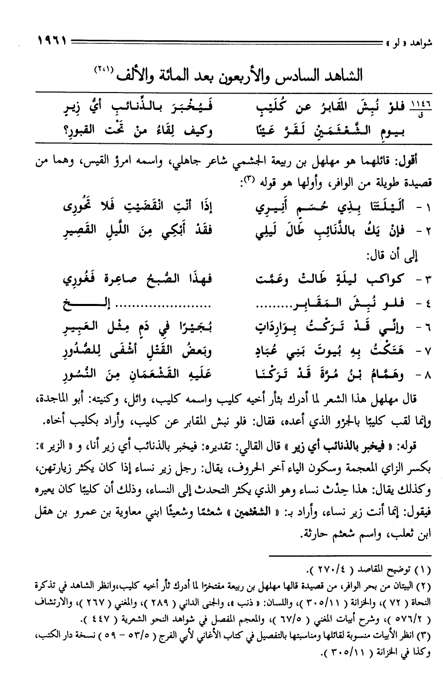 (¬2) البيتان من بحر الوافر، من قصيدة قالها مهلهل بن ربيعة مفتخرًا لما أدرك ثأر أخيه كليب، وانظر الشاهد في تذكرة النحاة (72)، والخزانة (11/ 305)، واللسان: "ذنب"، والجنى الداني (289)، والمغني (267)، والارتشاف (2/ 576)، وشرح أبيات المغني (5/ 67)، والمعجم المفصل في شواهد النحو الشعرية (447).