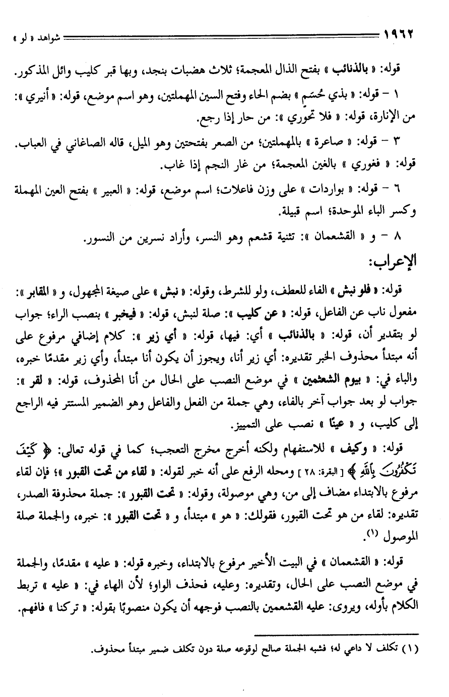 قوله: "فلو نبش" الفاء للعطف، ولو للشرط، وقوله: "نبش" على صيغة المجهول، و "المقابر": مفعول ناب عن الفاعل، قوله: "عن كليب": صلة لنبش، قوله: "فيخبر" بنصب الراء, جواب لو بتقدير أن، قوله: "بالذنائب" أي: فيها، قوله: "أي زير": كلام إضافي مرفوع على أنه مبتدأ محذوف الخبر تقديره: أي زير أنا، ويجوز أن يكون أنا مبتدأ، وأي زير مقدمًا خبره، والباء في: "بيوم الشعثمين" في موضع النصب على الحال من أنا المحذوف، قوله: "لقر": جواب لو بعد جواب آخر بالفاء، وهي جملة من الفعل والفاعل وهو الضمير المستتر فيه الراجع إلى كليب، و "عينًا" نصب على التمييز.