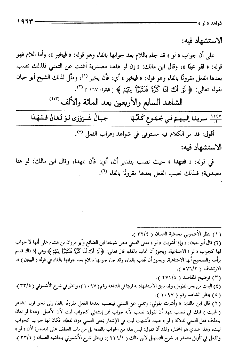 (¬6) قال ابن مالك: "وأشرت بقولي: وتغني عن التمني فينصب بعدها الفعل مقرونا بالفاء إلى نحو قول الشاعر (البيت) فلك في نصب ننهد أن تقول: نصب لأنه جواب تمن إنشائي كجواب ليت لأن الأصل: وددنا لو نعان بحذف فعل التمني لدلالة "لو" عليه، فأشبهت ليت في الإشعار بمعنى التمني دون لفظه، فكان لها جواب كجواب ليت، وهذا عندي هو المختار، ولك أن تقول: ليس هذا من الجواب بالفاء، بل من باب العطف على المصدر، لأن "لو" والفعل في تأويل مصدر". شرح التسهيل لابن مالك (1/ 229)، وينظر شرح الأشموني بحاشية الصبان (4/ 33).