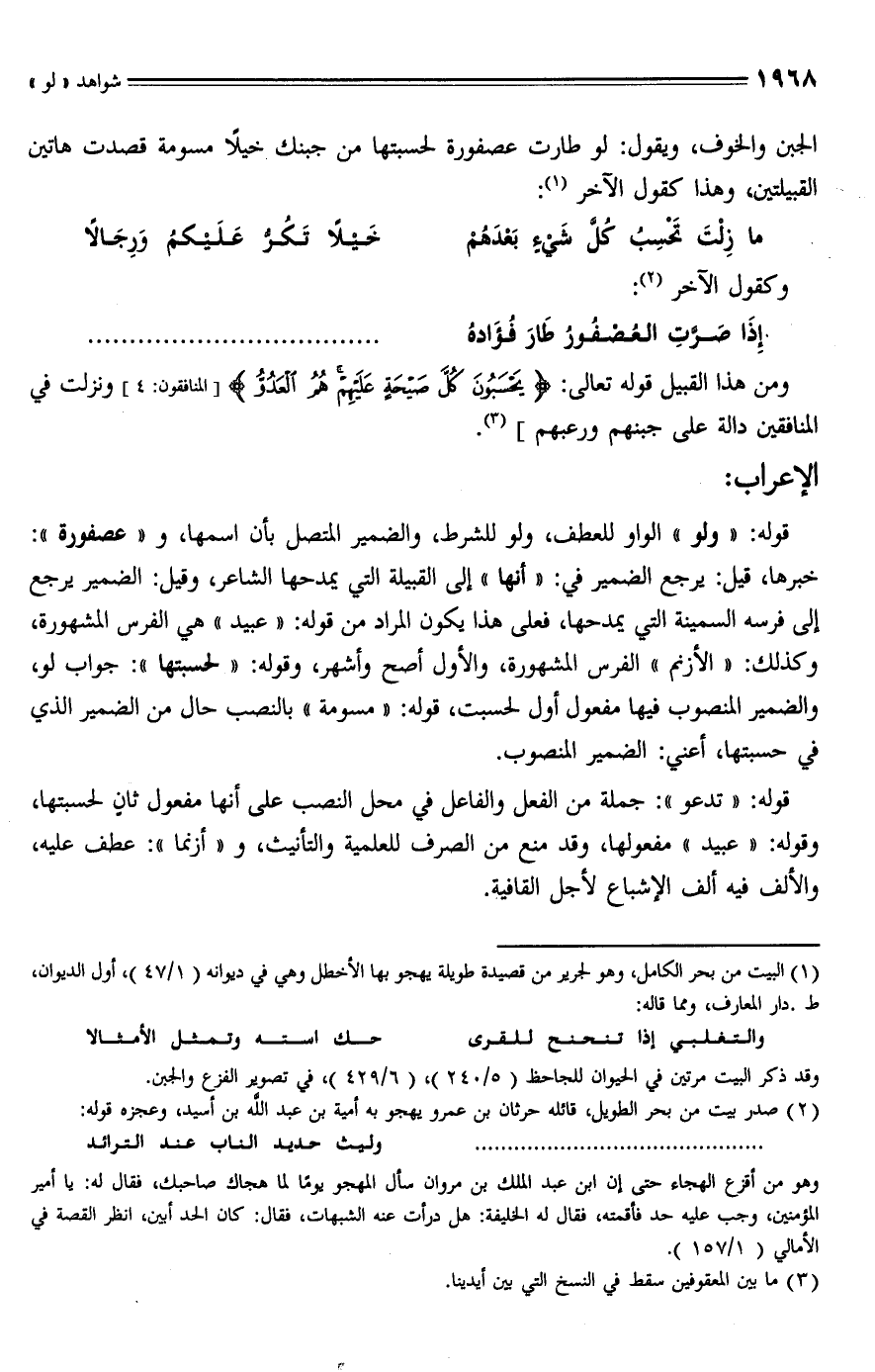 قوله: "ولو" الواو للعطف، ولو للشرط، والضمير المتصل بأن اسمها، و "عصفورة": خبرها، قيل: يرجع الضمير في: "أنها" إلى القبيلة التي يمدحها الشاعر، وقيل: الضمير يرجع إلى فرسه السمينة التي يمدحها، فعلى هذا يكون المراد من قوله: "عبيد" هي الفرس المشهورة، وكذلك: "الأزنم" الفرس المشهورة، والأول أصح وأشهر، وقوله: "لحسبتها": جواب لو، والضمير المنصوب فيها مفعول أول لحسبت، قوله: "مسومة" بالنصب حال من الضمير الذي في حسبتها، أعني: الضمير المنصوب.