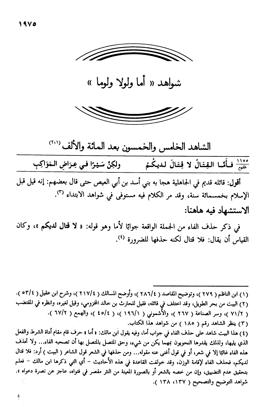 (¬4) هذا البيت شاهد على حذف الفاء في جواب أما، وفيه يقول ابن مالك: "أما" حرف قام مقام أداة الشرط والفعل الذي يليها، ولذلك يقدرها النحويون بمهما يكن من شيء، وحق المتصل بالمتصل بها أن تصحبه الفاء ... ولا تحذف هذه الفاء غالبًا إلا في شعر، أو في قول أغنى عنه مقوله ... ومن حذفها في الشعر قول الشاعر (البيت) أرد: فلا قتال لديكم، فحذف الفاء لإقامة الوزن، وقد خولفت القاعدة في هذه الأحاديث -أي التي ذكرها ابن مالك- فعلم بتحقيق عدم التضييق، وإن من خصه بالشعر أو بالصورة المعينة من النثر مقصر في فتواه، عاجز عن نصرة دعواه". شواهد التوضيح والتصحيح (137، 138).