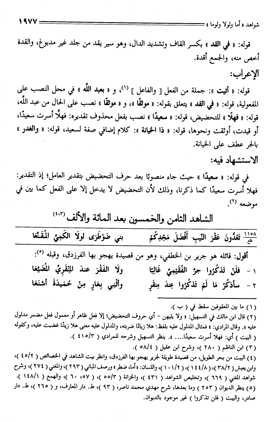 (¬4) البيت من بحر الطويل، من قصيدة طويلة لجرير يهجو بها الفرزدق، وانظر بيت الشاهد في الخصائص (2/ 45)، وابن يعيش (2/ 38)، (8/ 144)، (2/ 101)، واللسان: "أما، ضطر" ورصف المباني (293)، والمغني (274)، وشرح شواهد المغني (669)، وتخليص الشواهد (431)، والخزانة (3/ 55)، (57، 60)، والهمع (1/ 148).