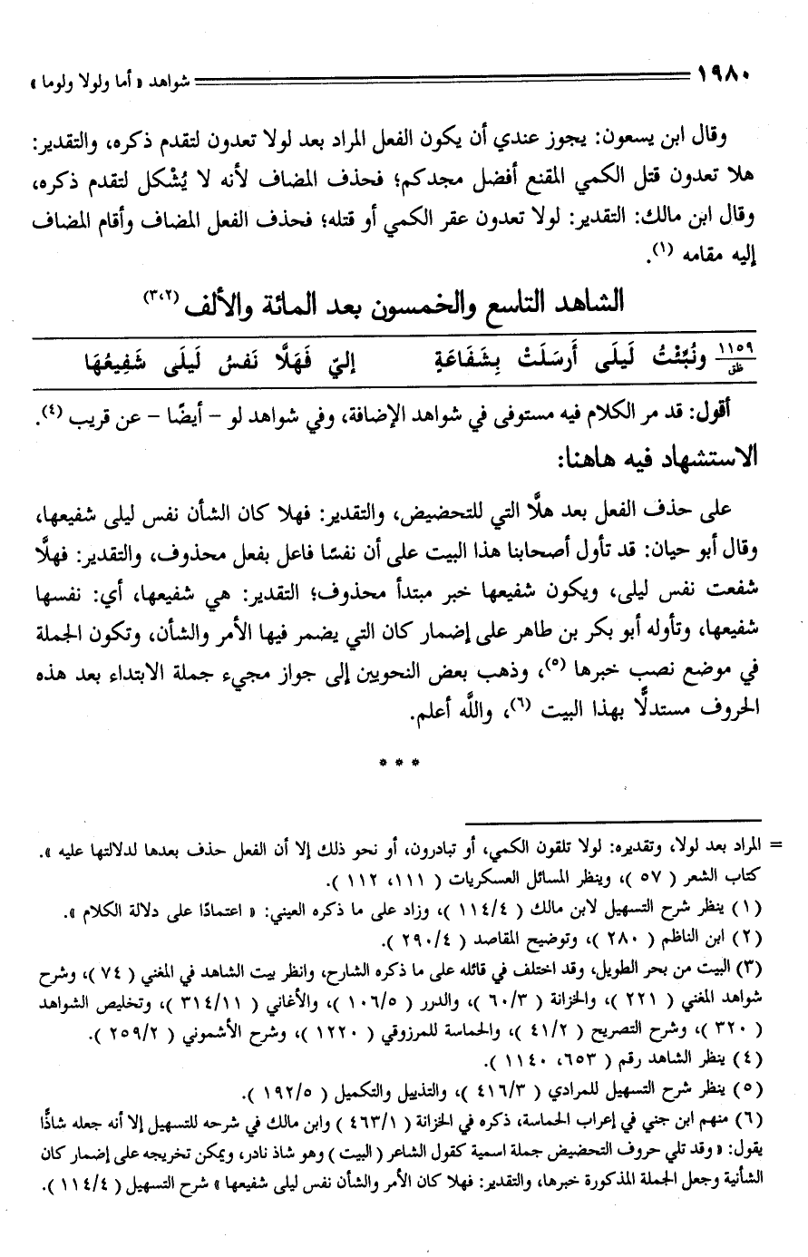 (¬6) منهم ابن جني في إعراب الحماسة، ذكره في الخزانة (1/ 463) وابن مالك في شرحه للتسهيل إلا أنه جعله شاذًّا يقول: "وقد تلي حروف التحضيض جملة اسمية كقول الشاعر (البيت) وهو شاذ نادر، ويمكن تخريجه على إضمار كان الشأنية وجعل الجملة المذكورة خبرها، والتقدير: فهلا كان الأمر والشأن نفس ليلى شفيعها" شرح التسهيل (4/ 114).