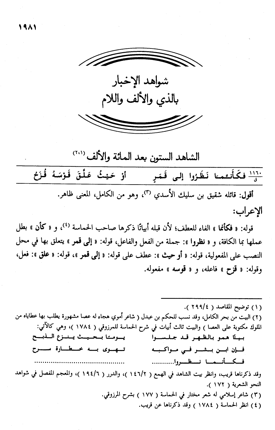 قوله: "فكأنما" الفاء للعطف؛ لأن قبله أبياتًا ذكرها صاحب الحماسة (¬4)، و "كأن" بطل عملها بما الكافة، و "نظروا": جملة من الفعل والفاعل، قوله: "إلى قمر" يتعلق بها في محل النصب على المفعولية، قوله: "أو حيث": عطف على قوله: "إلى قمر"، قوله: "علق": فعل، وقوله: "قزح" فاعله، و"قوسه" مفعوله.