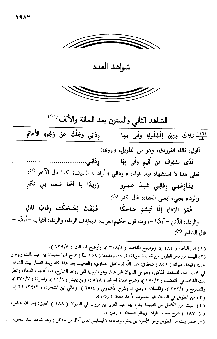(¬2) البيت من بحر الطويل من قصيدة طويلة للفرزدق وعددها (159 بيتًا) يمدح فيها سليمان بن عبد الملك ويهجو جريرًا وقيسًا، ديوانه (851) بتحقيق: عبد الله إسماعيل الصاوي، والعجيب بعد هذا كله وبعد انتشار بيت الشاهد في كتب النحو للشاهد المذكور، وهو في الديوان غير هذا، وهو بالرواية التي رواها الشارح، فما أعجب النحاة، وانظر بيت الشاهد في المقتضب (2/ 170)، وشرح عمدة الحافظ (518)، وابن يعيش (6/ 21)، والخزانة (7/ 370)، والتصريح (2/ 272)، واللسان: "ردي"، وشرح الأشموني (4/ 65)، وأمالي ابن الشجري (2/ 24، 64).