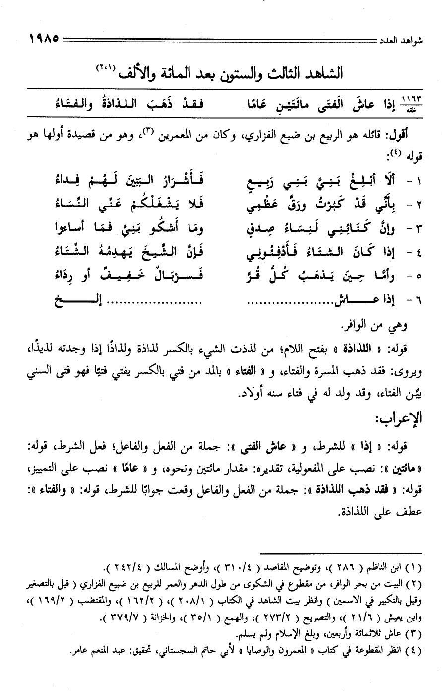 (¬2) البيت من بحر الوافر، من مقطوع في الشكوى من طول الدهر والعمر للربيع بن ضبيع الفزاري (قيل بالتصغير وقيل بالتكبير في الاسمين) وانظر بيت الشاهد في الكتاب (1/ 208)، (2/ 162)، والمقتضب (2/ 169)، وابن يعيش (6/ 21)، والتصريح (2/ 273)، والهمع (1/ 35)، والخزانة (7/ 379).